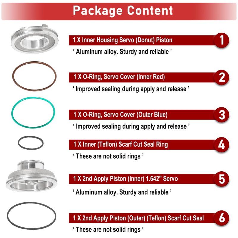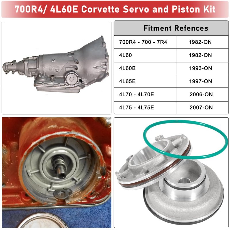 APPLICATION -- For 1982-On Corvette Style TH700-R4 4L60 4L60E 4L65E. 2nd gear Auto Transmission servo piston Kit. [ 700R4 - 700 - 7R4 1982-ON, 4L60 1982-ON, 4L60E 1993-ON, 4L65E 1997-ON, 4L70 - 4L70E 2006-ON, 4L75 - 4L75E 2007-ON]. BEBEFITS -- Increased apply area provides the 2-4 band greater torque capacity in second gear only for your hard working trans! This kit is a must-have upgrade, not originally found in any transmissions besides Corvette. It creates a much firmer 2nd and 3rd Shift.. QUALITY -- Manufactured from aluminum alloy. It has the advantages of a fine rigid structuresturdy and reliable. Teflon seals improved sealing during apply and release. This servo is build specifically for high-performance applications and is fully compatible with valve body kits.. PACKAGE CONTENT -- 1 X Inner Housing Servo (Donut) Piston, 1 X 2nd Apply Piston (Inner) 1.642" Servo, 1 X Inner (Teflon) Scarf Cut Seal Ring (These are not solid rings), 1 X 2nd Apply Piston (Outer) (Teflon) Scarf Cut Seal Ring (These are not solid rings), 1 X O-Ring, Servo Cover (Inner Red), 1 X O-Ring, Servo Cover (Outer Blue)..Other fine products