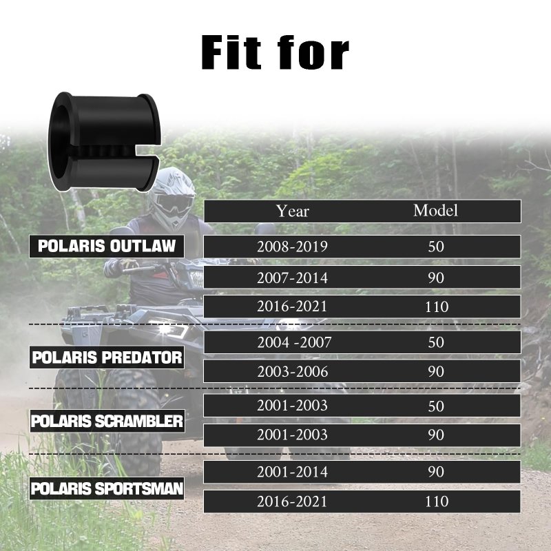 High Wear Resistance: The steering shaft sleeve bushing is made of wear-resistant materials, it can withstand long-term use and friction, extending the service life of the parts.. Easy Installation: This set of bushings can directly replace the original parts, and the installation process is simple without the need for additional modifications or adaptation.. Good Shock Absorption Performance: The steering shaft bushing with good shock absorption performance, it can reduce vibration and noise during driving.. Rubber Material: The steering shaft sleeve is made of rubber material and has good durability.. Fit for: Polaris Outlaw 50 2008-2019; Polaris Outlaw 90 2007-2014; Polaris Outlaw 110 2016-2021; Polaris Predator 50 2004 -2007; Polaris Predator 90 2003-2006; Polaris Scrambler 50 2001-2003; Polaris Scrambler 90 2001-2003; Polaris Sportsman 90 2001-2014; Polaris Sportsman 110 2016-2021..Other fine products