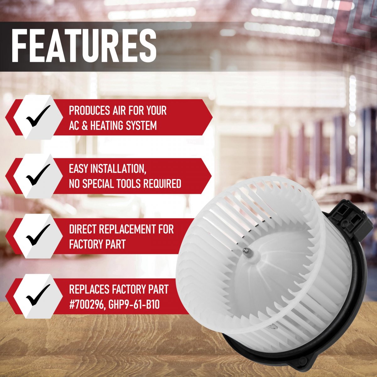 REPLACEMENT BLOWER MOTOR ASSEMBLY - responsible for producing air that goes through the vents of your vehicle's AC and heating system. If your AC or Heater does not produce or circulate any heated or cooled air, then you may have a problem with your blower motor.. COMPATIBLE REPLACEMENT FOR MAZDA VEHICLES - 2014, 2015, 2016, 2017, 2018 3 2.0L, 2.5L 2013, 2014, 2015, 2016 CX-5 2.0L, 2.5L . The blower motor can be easily located on the passenger side of the vehicle inside the glove box. It can be installed by removing a few screws. It is also advisable to replace your blower motor relay or resistor with a new one when replacing the blower motor.. REPLACES PART NUMBERS - 700296, GHP9-61-B10, KD45-61-B10, GHP961B10, KD4561B10, MA3126109 commonly found on popular Mazda 3 and CX-5 models including years 13, 14, 15, 16, 17 and 18. This replacement blower motor by AA Ignition comes with fans so you can get your Heater or AC System up and running quickly.. OEM FIT, QUALITY & FINISH - While this is not a genuine OEM part, it is a direct replacement and it will look, fit, and function like the factory blower motor on your vehicle, if not better. Save time and money by purchasing this part and replacing it yourself..Other fine products