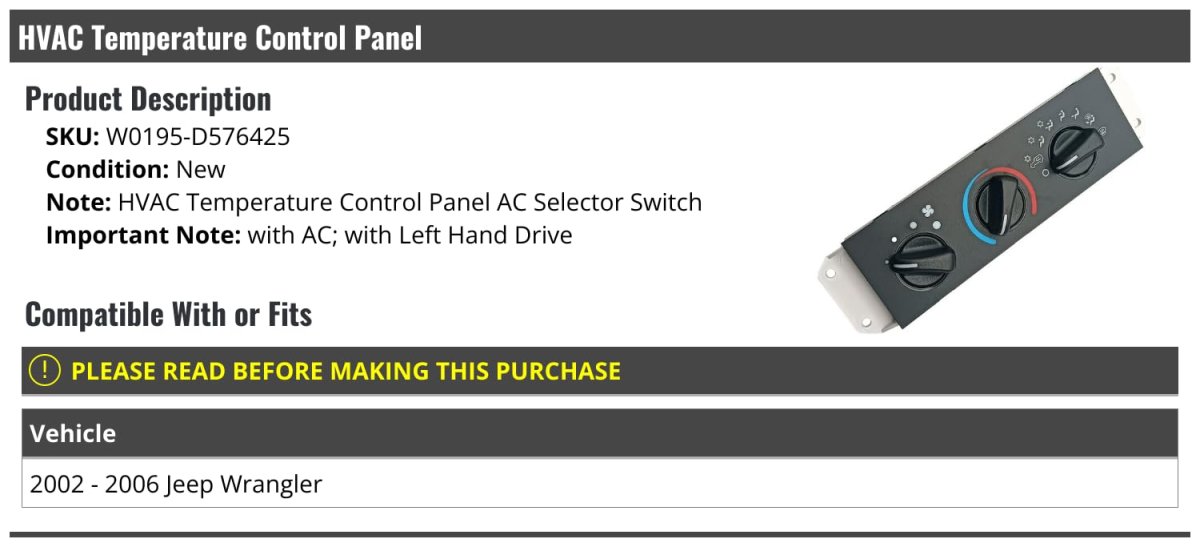 - Hvac Heater Temperature Control Panel Ac Selector Switch For 2002-2006 Jeep Wrangler With