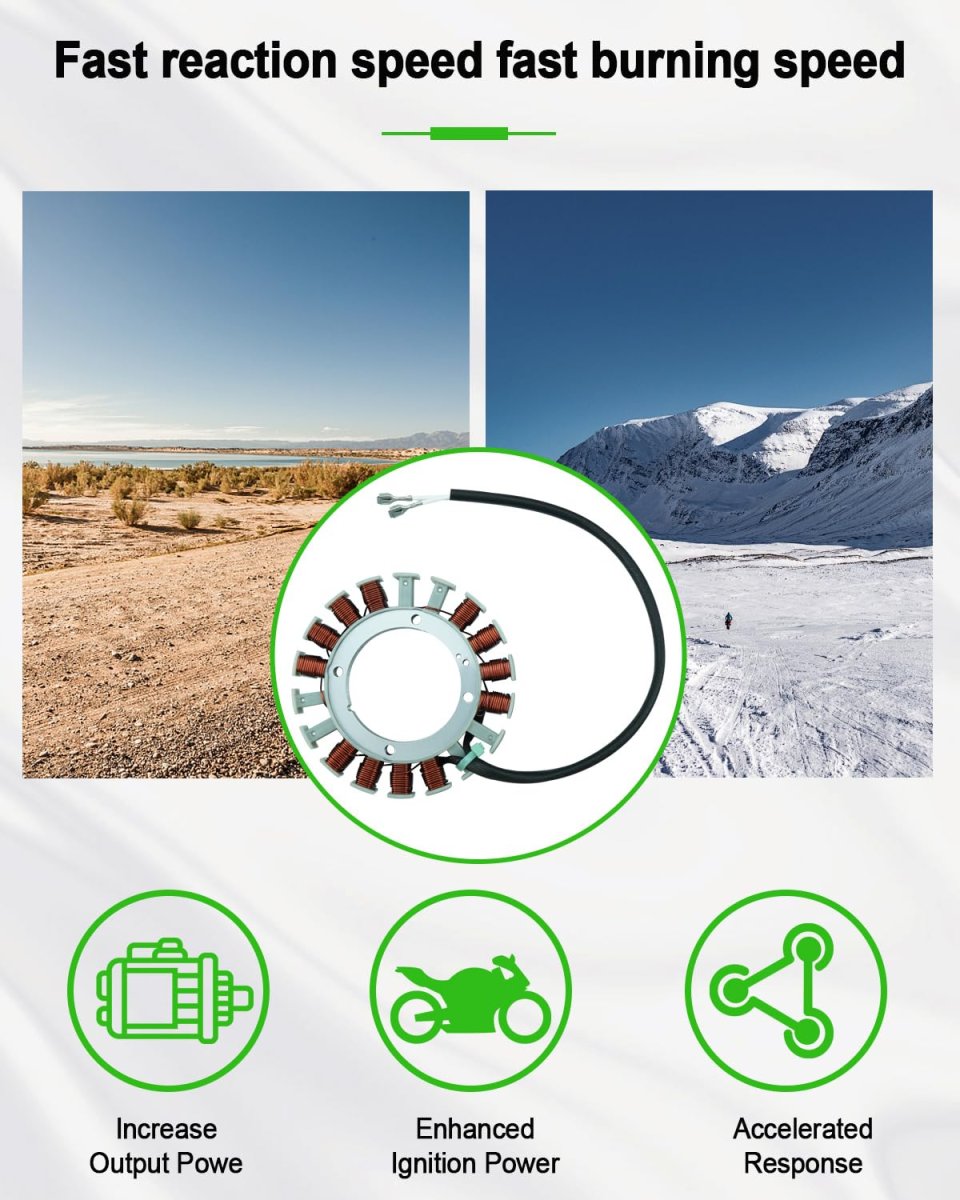 High-efficiency Energy Conversion: Ignition charging coil stator enables the conversion from low-pressure energy to high-pressure energy, ensures spark prevention, obtains sufficient ignition energy, improves combustion efficiency, and improves engine performance and fuel economy. Perfect Compatibility: Ignition charging coil stator fit for specific Kawasaki FH381V FH430V FH451V FH480V FH500V FH541V FH580V FH601D FH601V FH641V FH680D FH680V FH721D FH721V FH770D FX751D FX850V FXT00V Model Engines replacing part numbers 59031-7009 59031-7001 59031-7014. Durable & Sturdy: Vehicle ignition coil materials are made of iron core, insulation material and copper wire. It is resistant to high temperatures and corrosion, can maintain their performance even in extreme working environments, ensuring long-term stable operation, reducing failure rates and protecting components. High-voltage Output: Vehicle ignition coil provide enhanced ignition power, increase engine output, improve acceleration response, and ensure reliable ignition of the internal engine under various operating conditions. Exquisite Design: Ignition charging coil stator has excellent casting technology, small size, easy installation, quick replacement, and is fully compatible with automobile engines. It can be used for a long time, saving time and money.Other fine products