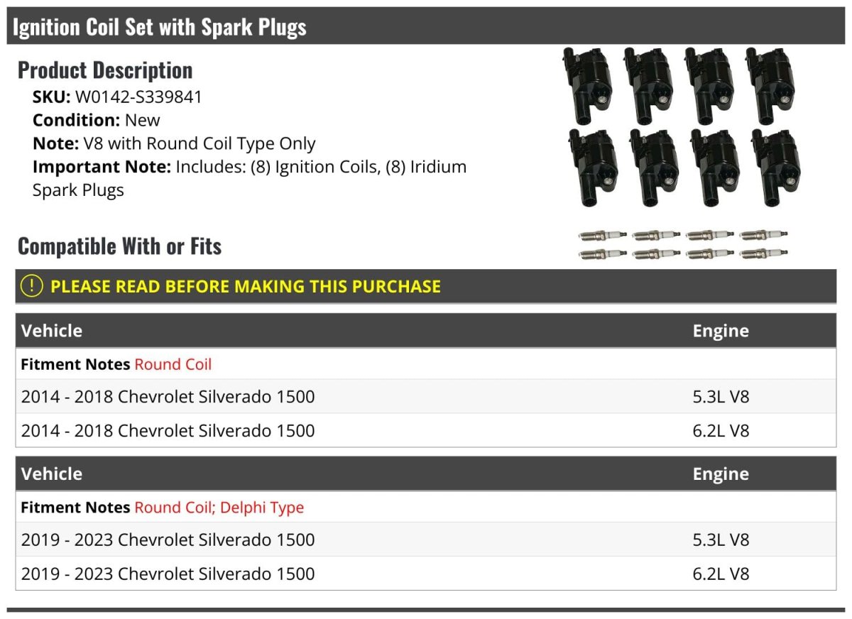 Compatible with or fits: (Note: Round Coil) 2014 - 2018 Chevy Silverado 1500 5.3L V8. Compatible with or fits: (Note: Round Coil) 2014 - 2018 Chevy Silverado 1500 6.2L V8. Compatible with or fits: (Note: Round Coil; D.e.l.p.h.i Type) 2019 - 2023 Chevy Silverado 1500 5.3L V8. Compatible with or fits: (Note: Round Coil; D.e.l.p.h.i Type) 2019 - 2023 Chevy Silverado 1500 6.2L V8. Includes: (8) Ignition Coils - (8) Iridium Spark Plugs.Other fine products