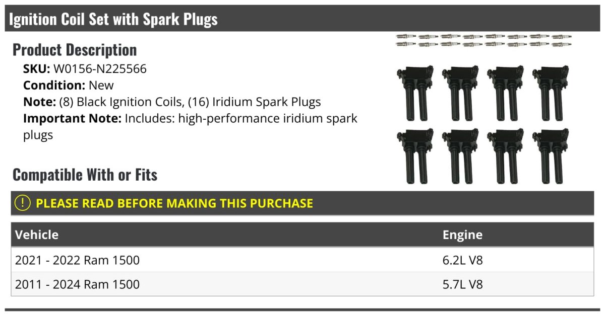- Ignition Coil And Iridium Spark Plug Kit 24-piece For 2011-2024 Ram 1500