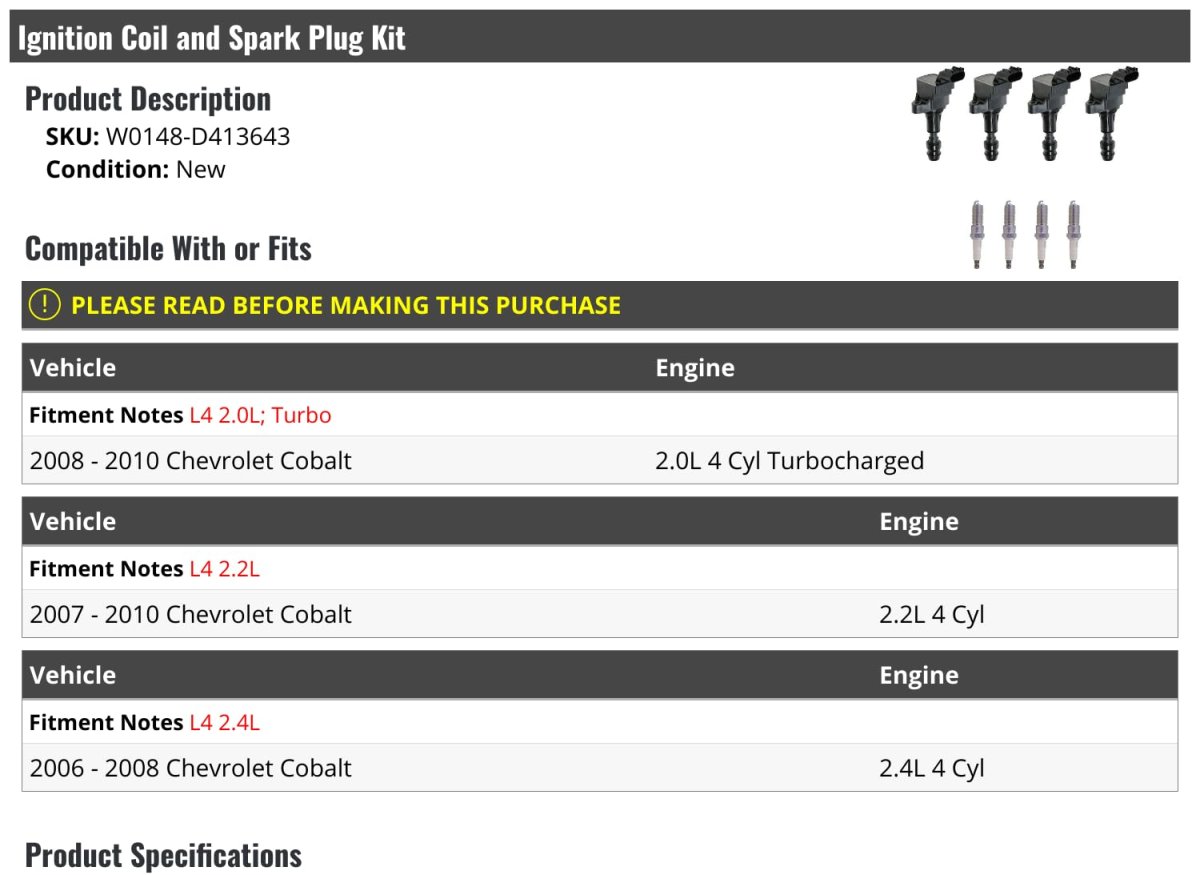Compatible with or fits: (Note: L4 2.0L; Turbo; 2008 - 2010 Chevrolet Cobalt 2.0L 4 Cyl Turbocharged). Compatible with or fits: (Note: L4 2.2L; 2007 - 2010 Chevrolet Cobalt 2.2L 4 Cyl). Compatible with or fits: (Note: L4 2.4L; 2006 - 2008 Chevrolet Cobalt 2.4L 4 Cyl). Review Description to Ensure Proper Fit.Other fine products