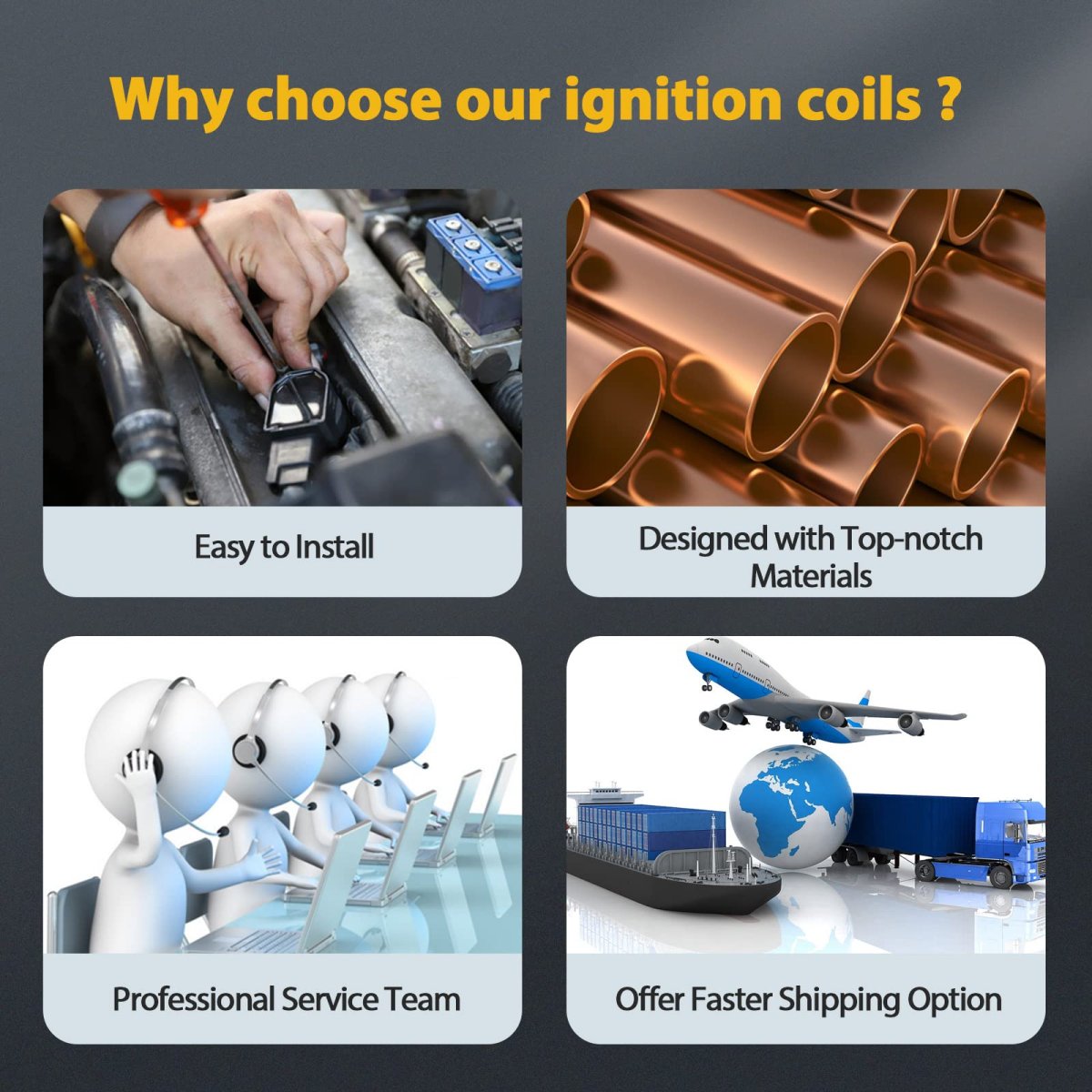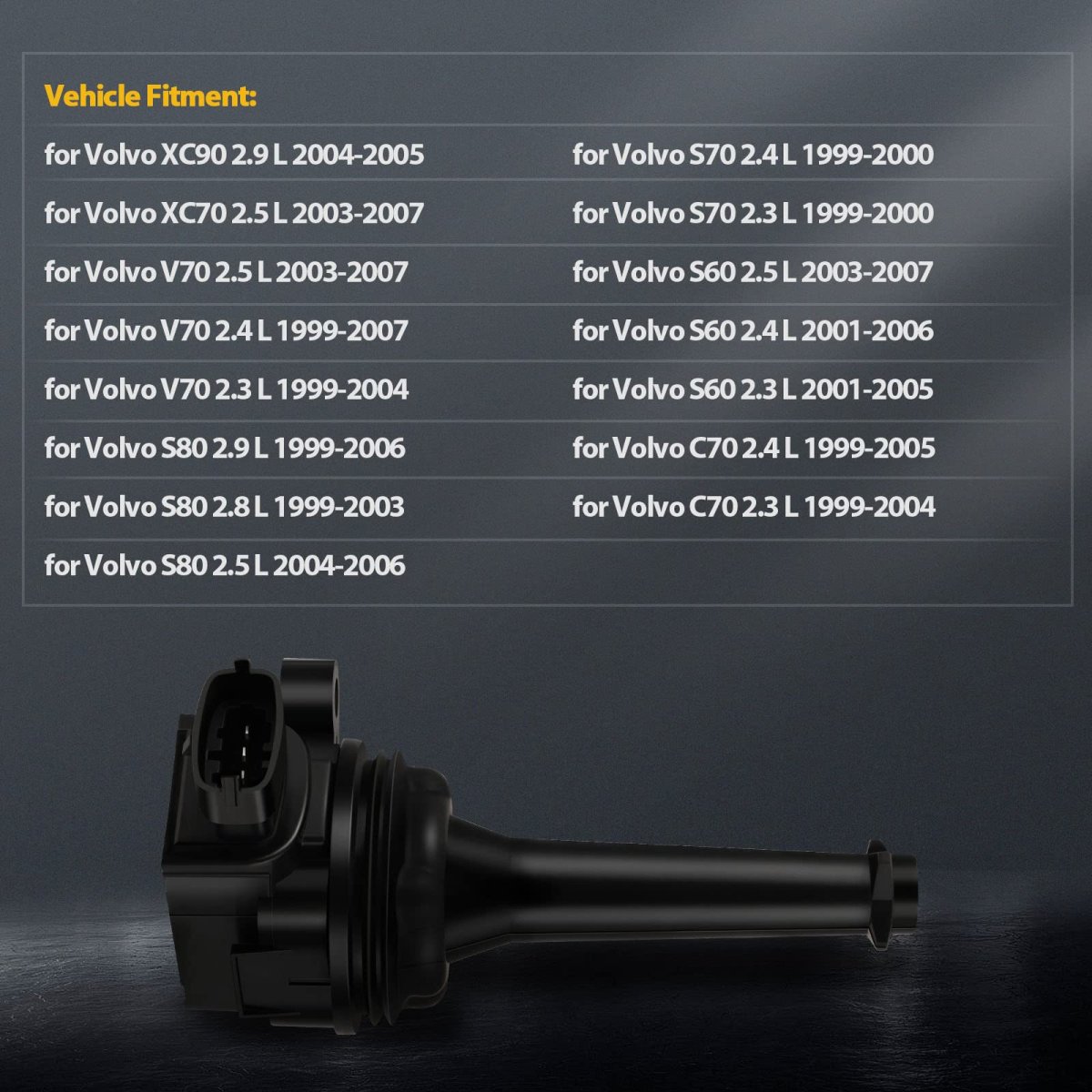 Compatible Vehicle : for Volvo XC90 2.9L 2004-2005,for Volvo XC70 2.5L 2003-2007,for Volvo V70 2.5L 2003-2007,for Volvo V70 2.4L 1999-2007,for Volvo V70 2.3L 1999-2004,for Volvo S80 2.9L 1999-2006,for Volvo S80 2.8L 1999-2003,for Volvo S80 2.5L 2004-2006,for Volvo S70 2.4L 1999-2000,for Volvo S70 2.3L 1999-2000,for Volvo S60 2.5L 2003-2007,for Volvo S60 2.4L 2001-2006,for Volvo S60 2.3L 2001-2005,for Volvo C70 2.4L 1999-2005,for Volvo C70 2.3L 1999-2004. Replaces OEM Part Numbers : C1258 5c1320 E371 52-1652 Ic471 Uf-341 30713416 9125601-6 9652. Premium Quality Material :You'll have an easy time mounting these coils due to their lightweight and winding construction. The copper material ensures maximum power delivery to the spark plugs. They come pre-greased for direct replacement.Superior winding process yields greater wire length control, which means less chance of a breakdown of the wire coating and insulation. Material resists pinholes and cracks that can cause failures. Function & OEM Fit:OCPTY Ignition Coils are engineered for original equipment and replacement applications.Every component either matches or improves on the OE design to ensure fast and easy installation with superior performance and reliability.The ignition coil acts like a transformer.the ignition coil transforms the electrical energy from the vehicle battery into high voltage, saves it briefly and then emits it as a high voltage current pulse to the spark plug.Other fine products