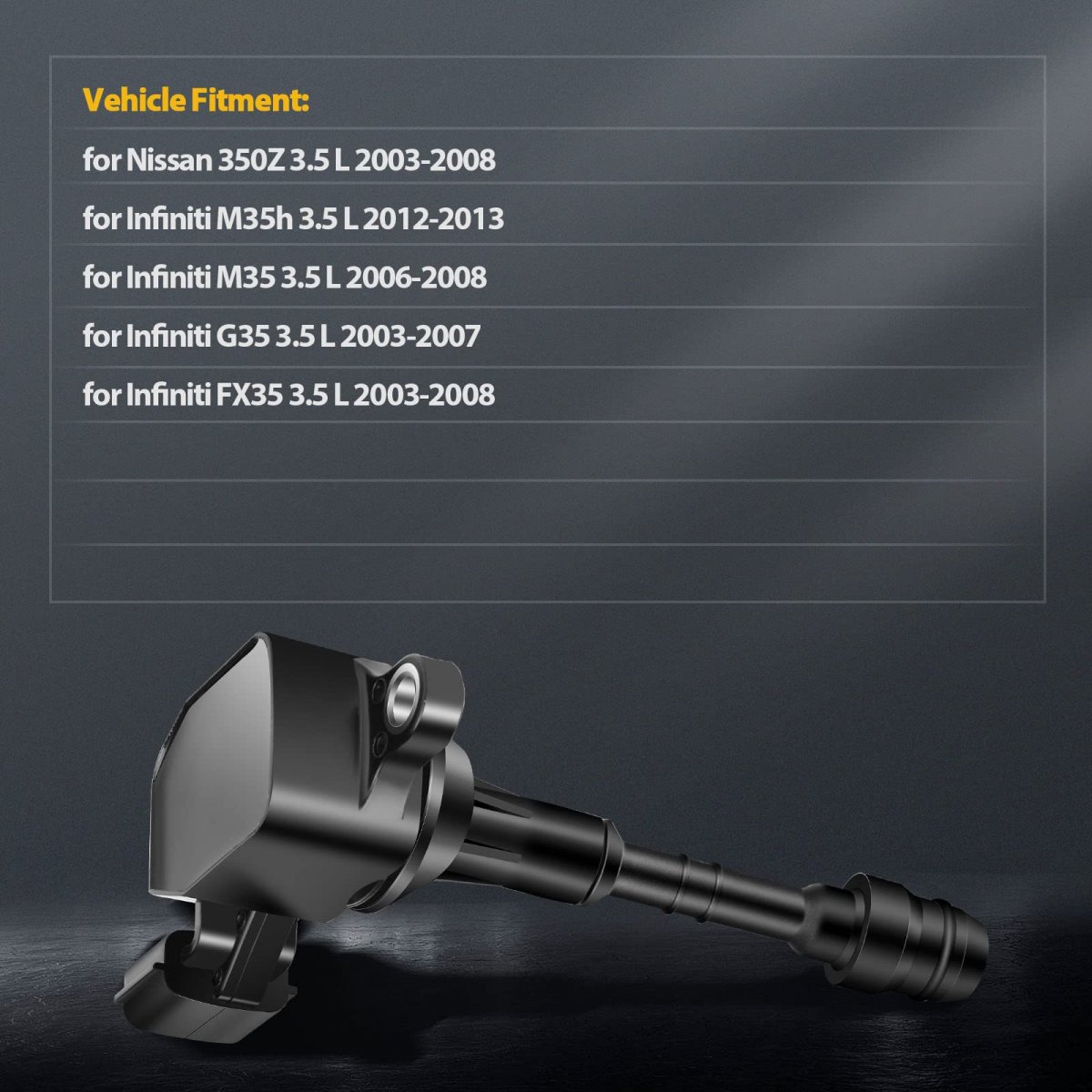 Compatible Vehicle - for Nissan 350Z 3.5L 2003-2008,for Infiniti M35h 3.5L 2012-2013,for Infiniti M35 3.5L 2006-2008,for Infiniti G35 3.5L 2003-2007,for Infiniti FX35 3.5L 2003-2008. Replaces OEM Part Numbers - 22433AL615,22433AL61C,22448AL615,C1439,22448-AL61C,UF-401,UF401,22448AL61C,E421,1788317,5C1430,C1439. Premium Quality Material - You'll have an easy time mounting these coils due to their lightweight and winding construction. The copper material ensures maximum power delivery to the spark plugs. They come pre-greased for direct replacement.Superior winding process yields greater wire length control, which means less chance of a breakdown of the wire coating and insulation. Material resists pinholes and cracks that can cause failures.. Function & OEM Fit - OCPTY Ignition Coils are engineered for original equipment and replacement applications.Every component either matches or improves on the OE design to ensure fast and easy installation with superior performance and reliability.The ignition coil acts like a transformer.the ignition coil transforms the electrical energy from the vehicle battery into high voltage, saves it briefly and then emits it as a high voltage current pulse to the spark plug..Other fine products