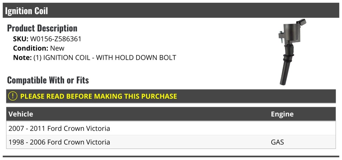 - Ignition Coil For 1998-2011 Ford Crown Victoria Gas