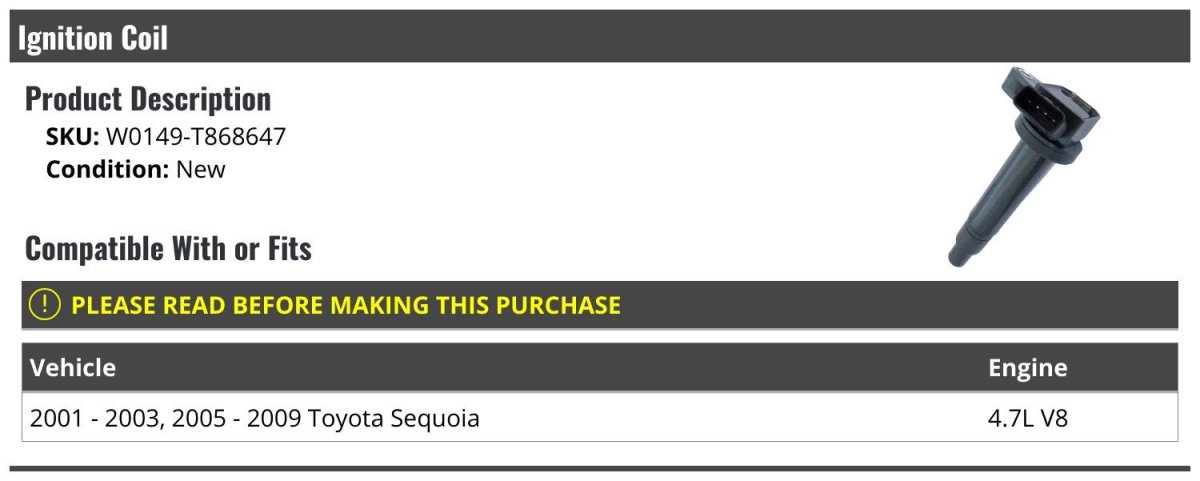 - Ignition Coil For 2001-2003 2005-2009 Toyota Sequoia 4 7l V8 Excludes 2004