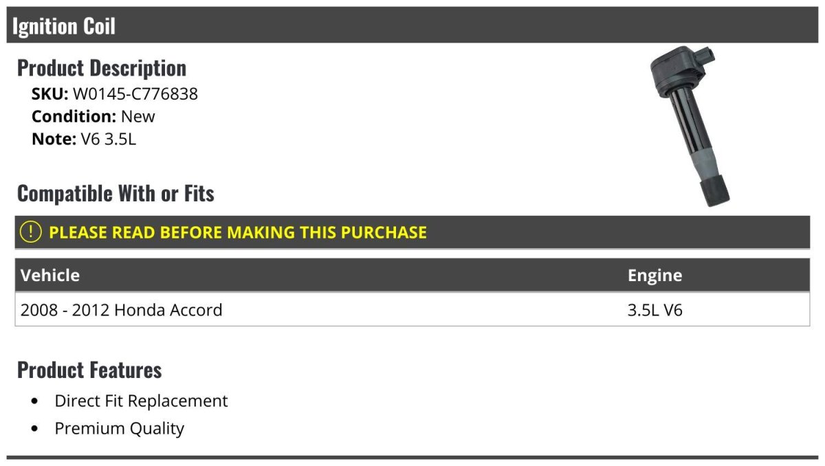 V6 3.5L. Compatible with or fits: 2008 - 2012 Honda Accord 3.5L V6. Direct Fit Replacement. Premium Quality. Ignition Coil.