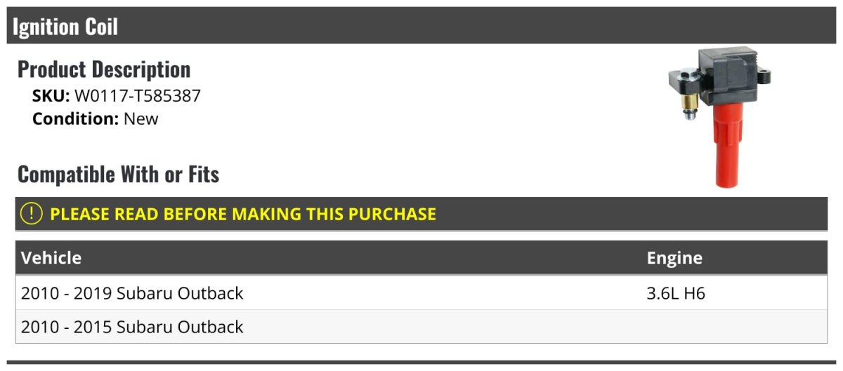 - Ignition Coil For 2010-2019 Subaru Outback 3 6l H6