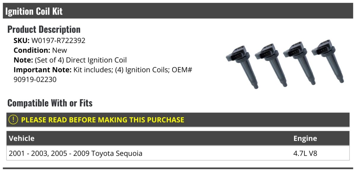 - Ignition Coil Kit 4 Piece For 2001-2003 2005-2009 Toyota Sequoia 7l V8
