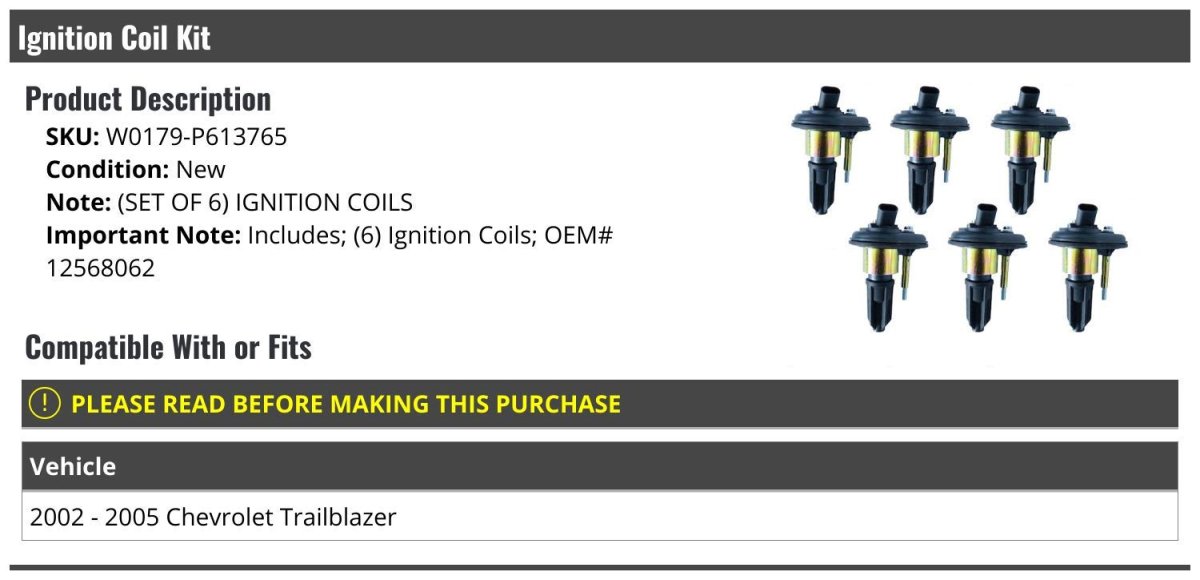 (Set of 6) IGNITION COILS. Includes; (6) Ignition Coils; OEM# 12568062. Compatible with or fits: 2002 - 2005 Chevy Trailblazer. Ignition Coil Kit. Review Description to Ensure Proper Fit.