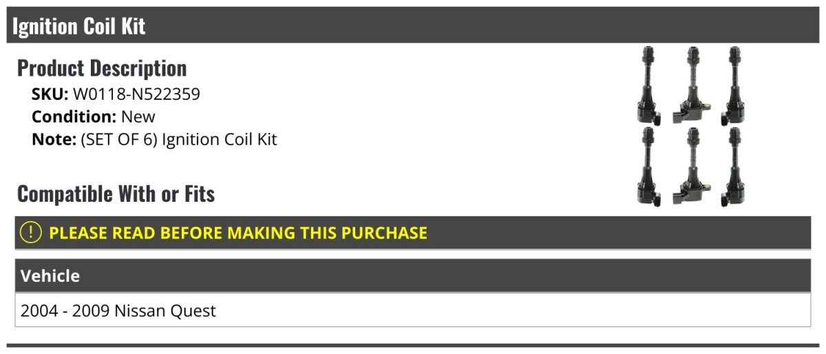 - Ignition Coil Kit 6-piece For 2004-2009 Nissan Quest