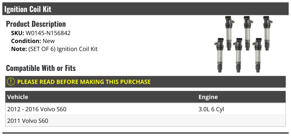 - Ignition Coil Kit 6-piece For 2011-2016 Volvo S60 3 0l 6-cylinder