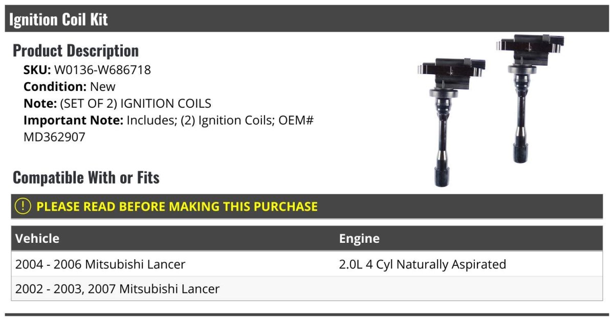 - Ignition Coil Kit Set Of 2 For002-2007 Mitsubishi Lancer 2 0l 4-cylinder