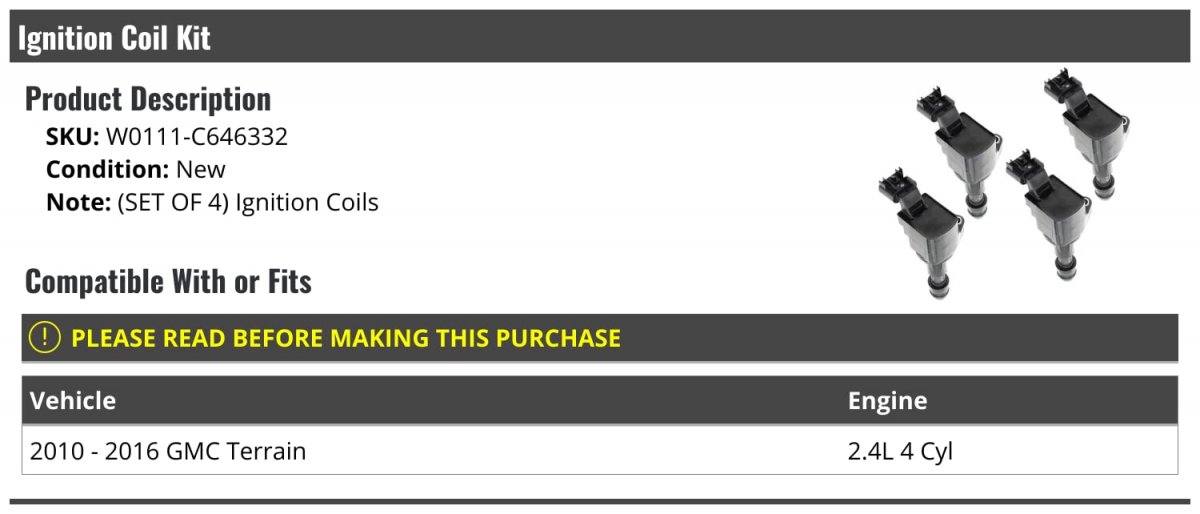 - Ignition Coil Kit Set Of 4 Compatible With 2010-2016 Gmc Terrain 2 4l 4-cylinder