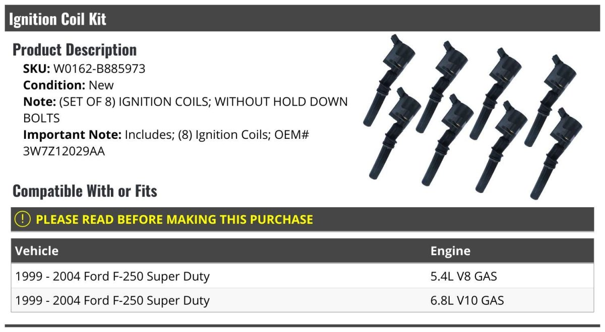 - Ignition Coil Kit Without Hold-down Bolts Set Of 8 For 1999-2004 Ford F-250 Super Duty