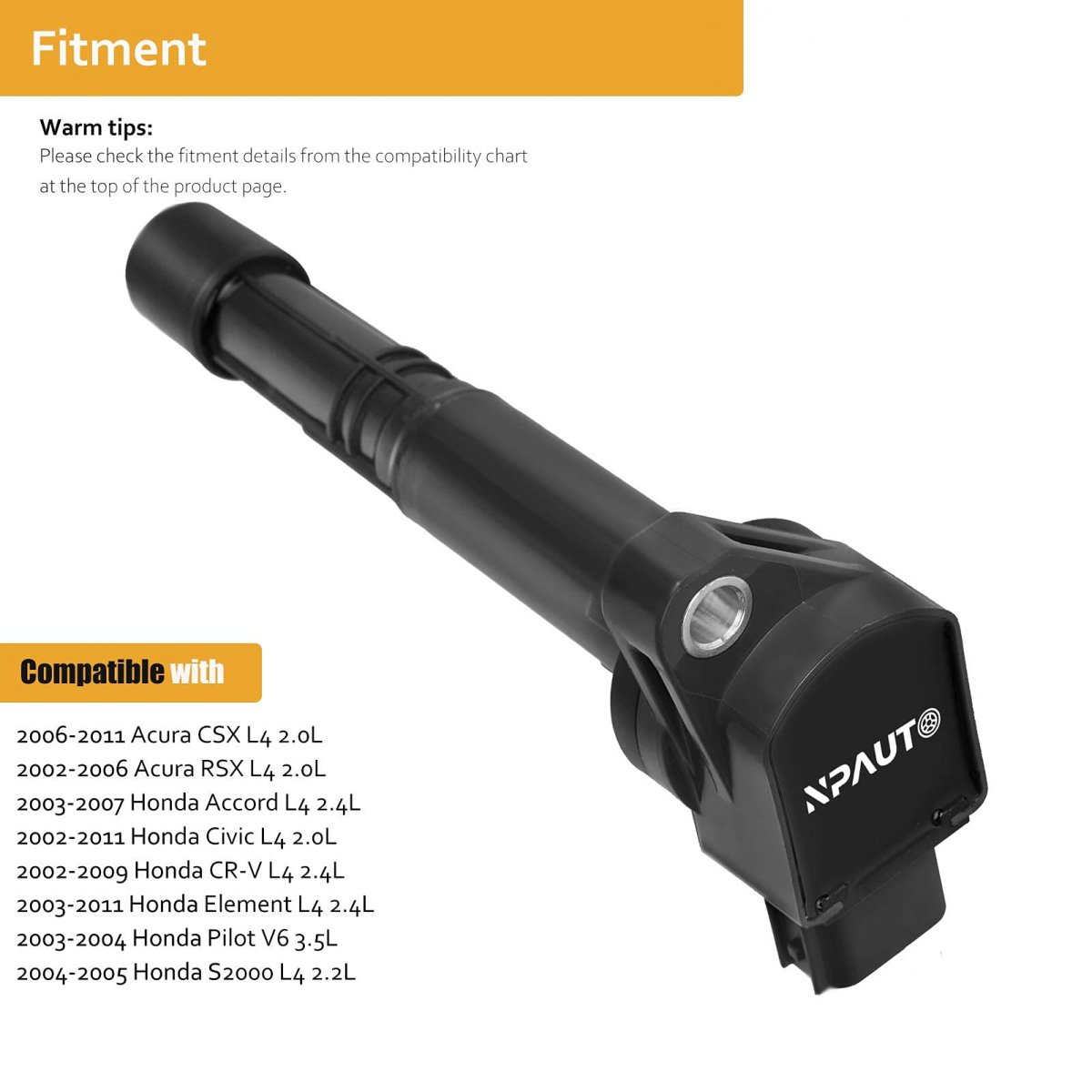 [Vehicles Fit] -Ignition coil pack replacement for 2002 2003 2004 2005 2006 2007 2008 2009 2010 2011 Honda Civic, Element, 02-09 CRV, 03-07 Accord, 03-04 Honda Pilot, 04-05 S2000, 06-11 Acura CSX, 02-06 Acura RSX, L4 2.0L 2.4L 2.2L. [High Performance Aftermarket Ignition Coils] - NPAUTO Ignition coils which will right fit for your car. It can solve issues caused by failed coils like Engine Misfire, Rough Engine Idle, Decrease in Power, Poor Fuel Economy etc.. [Interchange Part Number] - UF311, 5C1382, UF-311, UF-583, C1382, C1423, C1574, UF583, 099700-070, 30520-PMA-007, 30520-PNA-007,30520RRA007, 30520PMA007, 30520PNA007, 30520PWA003, 30520RAA007. [Quality Tested] - From internal coils to housing, quality materials are choosen to improve durablity and reliability. And this part has undergone extensive testing to ensure a quality fit and long lifespan..Other fine products