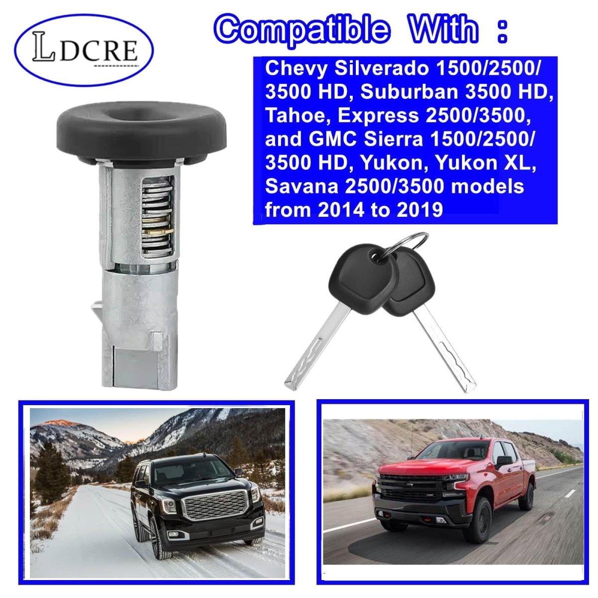 Compatible With: This ignition switch lock cylinder is compatible with Chevy Silverado 1500/2500/3500 HD, Suburban 3500 HD, Tahoe, Express 2500/3500, and GMC Sierra 1500/2500/3500 HD, Yukon, Yukon XL, Savana 2500/3500 models from 2014 to 2019.. Replace OE: The ignition key switch lock cylinder Direct replacement for OEM part numbers 84668679, 22855177, 23476975. Engineered to match factory specifications for form, fit, and function.. : The switch lock cylinder Constructed from durable zinc alloy with precision-cut key tumblers for smooth turning and long-term wear resistance. Includes two matching keys, ensuring seamless compatibility and dependable use.. Function: The ignition switch with key Restores proper ignition switch function, enabling reliable key insertion and turning. Helps eliminate common issues such as ignition lock-up, key sticking, or non-starting.. Package Include: 1 x ignition lock cylinder, 2 x pre-cut ignition keys (ready to use)..Other fine products