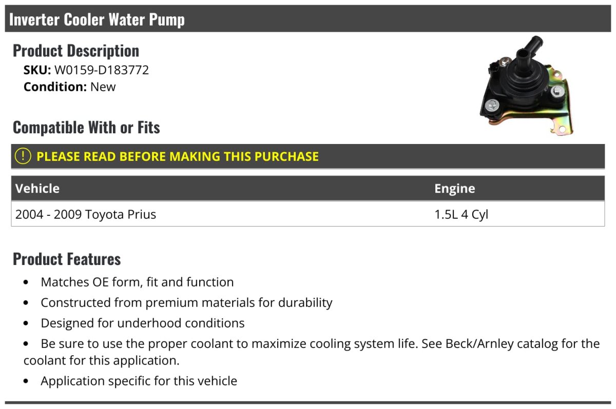 - Inverter Cooler Water Pump For 2004-2009 Toyota Prius 1 5l 4-cylinder