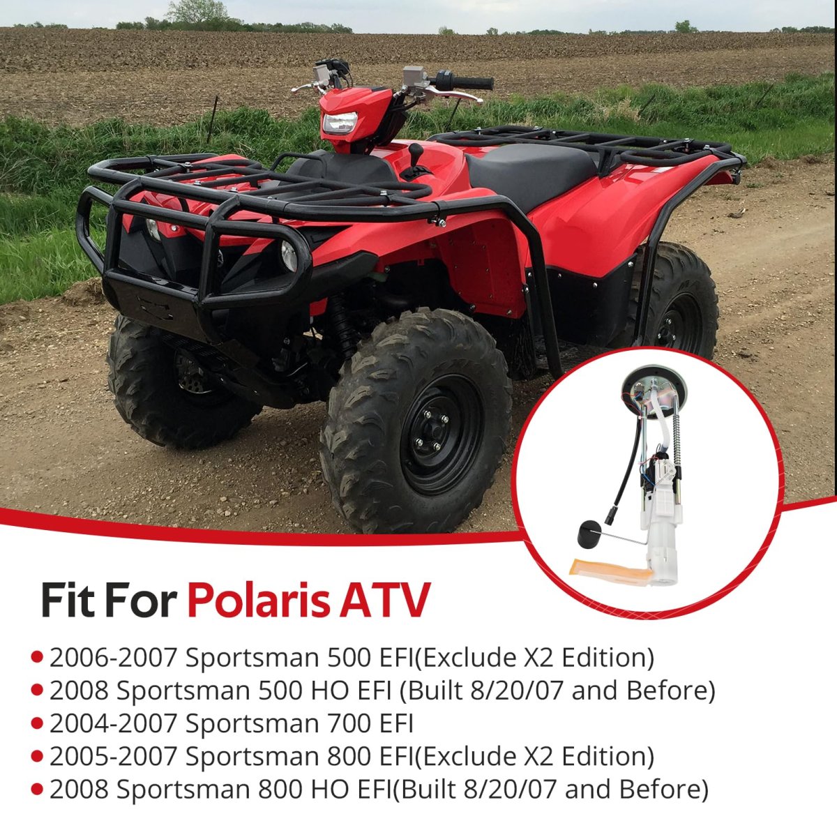 Fitment: Fit For Polaris ATV 2005-2007 Sportsman 800 EFI(Exclude X2 Edition); 2008 Sportsman 800 HO EFI(Built 8/20/07 and Before); 2004-2007 Sportsman 700 EFI; 2006-2007 Sportsman 500 EFI(Exclude X2 Edition); 2008 Sportsman 500 HO EFI (Built 8/20/07 and Before). Feature: Well made and factory specification.JAVIK fuel pump offers a continuous, stable supply of fuel and maintains the fuel system in proper working condition. O.E.M# 2520502 22520437 47-1041. Package: 1 pcs fuel pump assembly.Other fine products