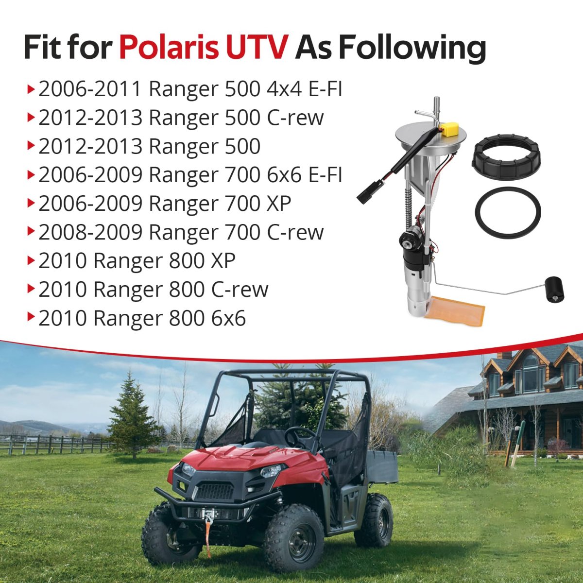 FitmentFit For Polaris UTV As Following: 2006-2011 Ranger 500 4x4 E-FI; 2012-2013 Ranger 500 Crew; 2012-2013 Ranger 500; 2006-2009 Ranger 700 6x6 E-FI; 2006-2009 Ranger 700 XP; 2008-2009 Ranger 700 Crew; 2010 Ranger 800 XP; 2010 Ranger 800 Crew; 2010 Ranger 800 6x6. Feature: Fuel pump assembly offers a continuous, stable supply of fuel and maintains the fuel system in proper working condition. O.E.M# 2204306 47-1009. Package: Fuel Pump Assembly x1, Retaining Nut x1, O-ring x1.Other fine products
