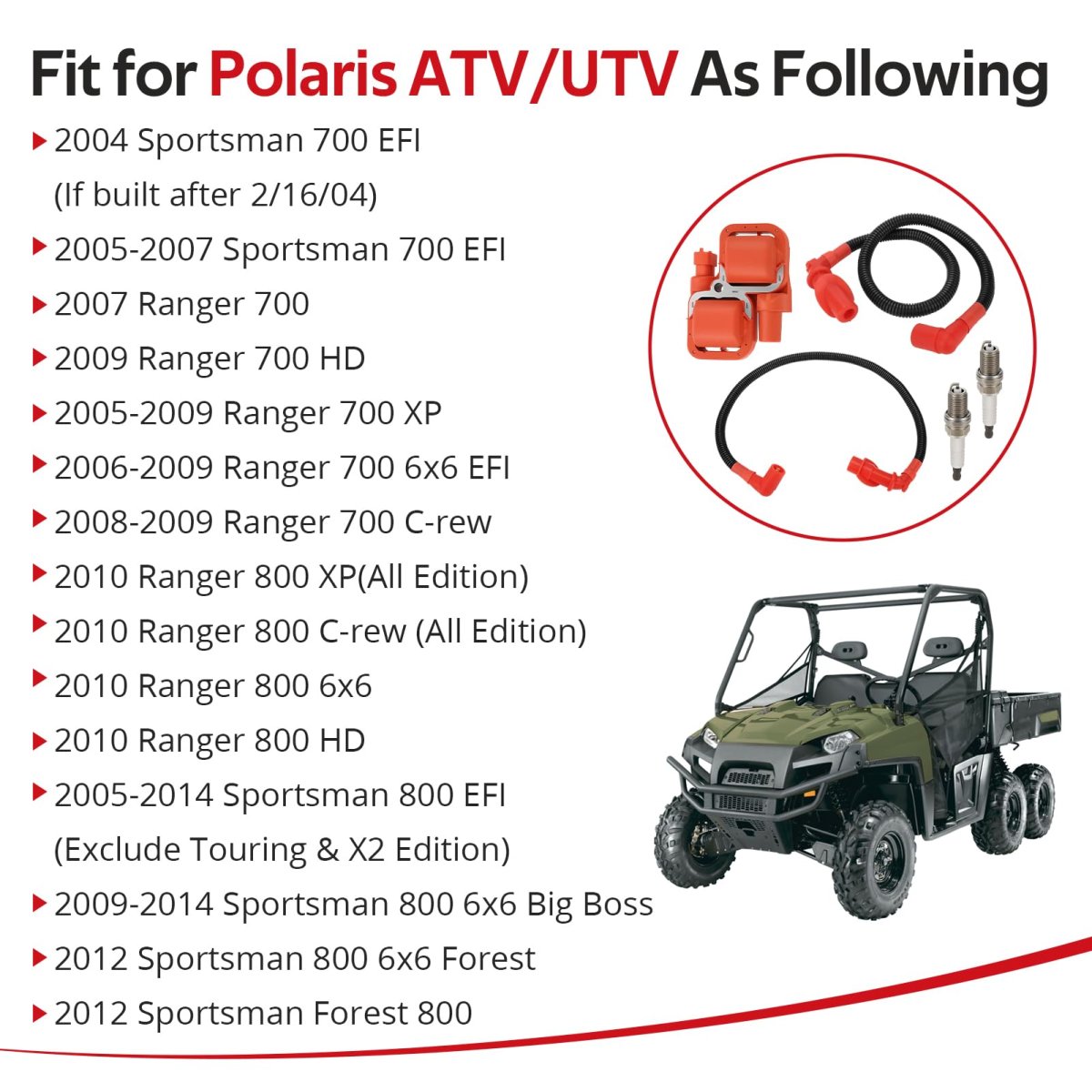 Fitment:Fit For Polaris ATV/UTV As Following: 2007 Ranger 700; 2009 Ranger 700 HD; 2005-2009 Ranger 700 XP; 2006-2009 Ranger 700 6x6 EFI; 2008-2009 Ranger 700 C-rew; 2010 Ranger 800 XP(All Edition); 2010 Ranger 800 C-rew(All Edition); 2010 Ranger 800 6x6; 2010 Ranger 800 HD. Fitment: 2004 Sportsman 700 EFI(If built after 2/16/04); 2005-2007 Sportsman 700 EFI; 2005-2014 Sportsman 800 EFI(Exclude Touring & X2 Edition); 2009-2014 Sportsman 800 6x6 Big Boss; 2012 Sportsman 800 6x6 Forest; 2012 Sportsman Forest 800. Feature: Well built and fix the problem you met. Replaced original parts, easy to use and operate. O.E.M# 4010425 3021671 4011365. Package: Spark Plug Wire Cap x2; Ignition Coil x1; Spark Plug x2.Other fine products