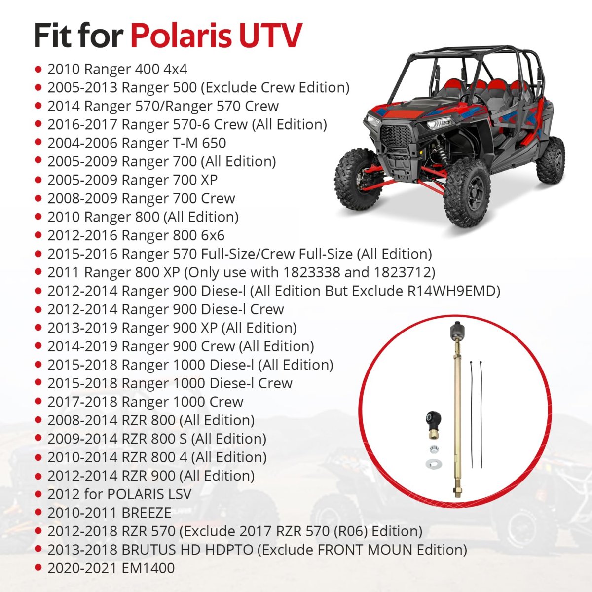 Fitment: Fit For Polaris UTV : 2010 Ranger 400 4x4; 2005-2013 Ranger 500 (Exclude Crew Edition); 2014 Ranger 570/Ranger 570 Crew; 2015-2016 Ranger 570 Full-Size/Crew Full-Size (All Edition); 2016-2017 Ranger 570-6 Crew (All Edition); 2004-2006 Ranger T-M 650; 2005-2009 Ranger 700 (All Edition); 2005-2009 Ranger 700 XP; 2008-2009 Ranger 700 Crew; 2010 Ranger 800 (All Edition); 2011 Ranger 800 XP (Only use with 1823338 and 1823712); 2012-2016 Ranger 800 6x6;. Fitment: 2012-2014 Ranger 900 Diese-l (All Edition But Exclude R14WH9EMD); 2012-2014 Ranger 900 Diese-l Crew; 2013-2019 Ranger 900 XP (All Edition); 2014-2019 Ranger 900 Crew (All Edition); 2015-2018 Ranger 1000 Diese-l (All Edition); 2015-2018 Ranger 1000 Diese-l Crew; 2017-2018 Ranger 1000 Crew; 2012-2018 RZR 570 (Exclude 2017 RZR 570 (R06) Edition); 2008-2014 RZR 800 (All Edition); 2009-2014 RZR 800 S (All Edition); 2010-2014 RZR 800 4 (All Edition); 2012-2014 RZR 900 (All Edition);etc. Feature: Well made and not easy to break or crack. Installation is straight forward and work as good as factory. Package: Left Steering Rack Tie Rod Kit x1.