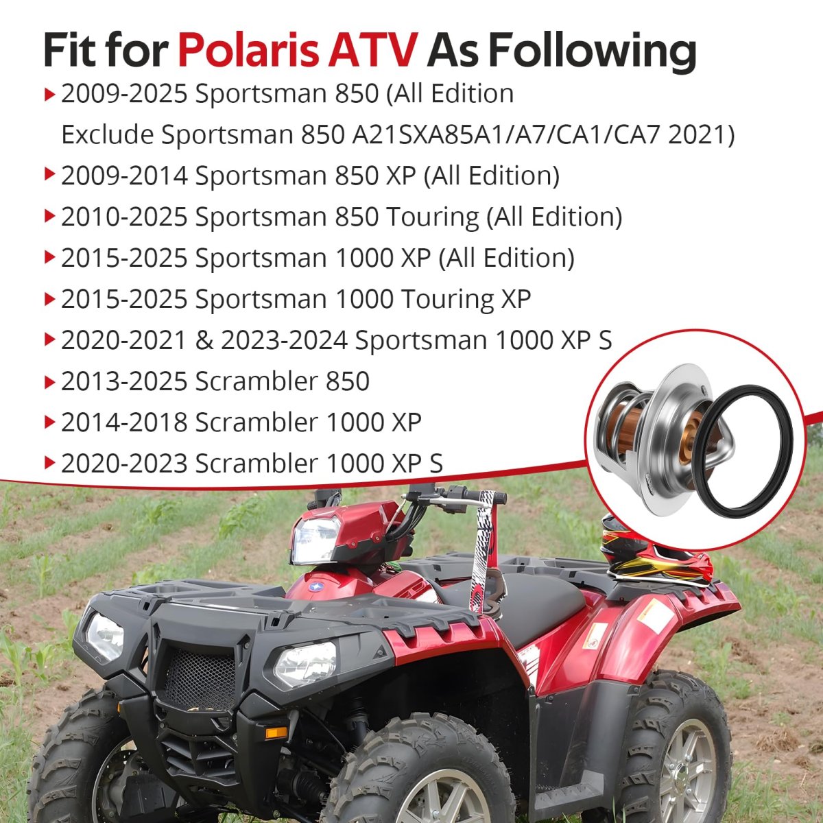Fitment: Fit for Polaris ATV As Following: 2009-2025 Sportsman 850 (All Edition Exclude Sportsman 850 A21SXA85A1/A7/CA1/CA7 2021); 2009-2014 Sportsman 850 XP (All Edition); 2010-2025 Sportsman 850 Touring (All Edition); 2015-2025 Sportsman 1000 XP (All Edition); 2015-2025 Sportsman 1000 Touring XP; 2020-2021 & 2023-2024 Sportsman 1000 XP S; 2013-2025 Scrambler 850; 2014-2018 Scrambler 1000 XP; 2020-2023 Scrambler 1000 XP S. Feature: Well made and everything work as soon as it was installed and stop your overheating issue. The package comes with the seal instead of purchasing separately. O.E.M# 7052445 7052561 5413948. Package: Thermostat x1, Seal x1.Other fine products