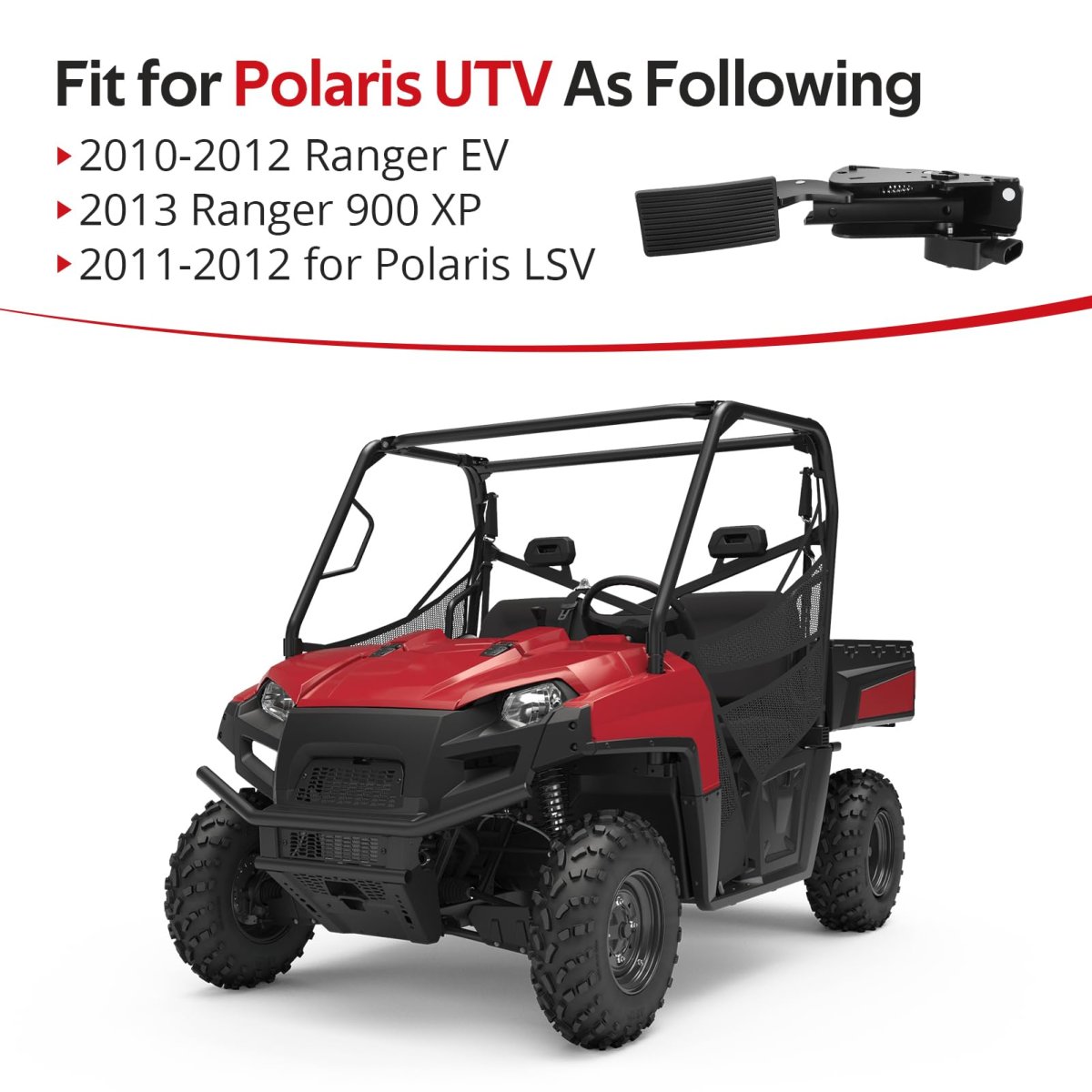 FitmentFit for Polaris UTV As Following:2010-2012 Ranger EV; 2013 Ranger 900 XP; 2011-2012 for Polaris LSV. Feature: Throttle position sensor pedals help you achieve more precise throttle control and solve stalling problems, improving engine efficiency. O.E.M# 4012657. Package: Throttle Position Sensor Pedal x1.Other fine products