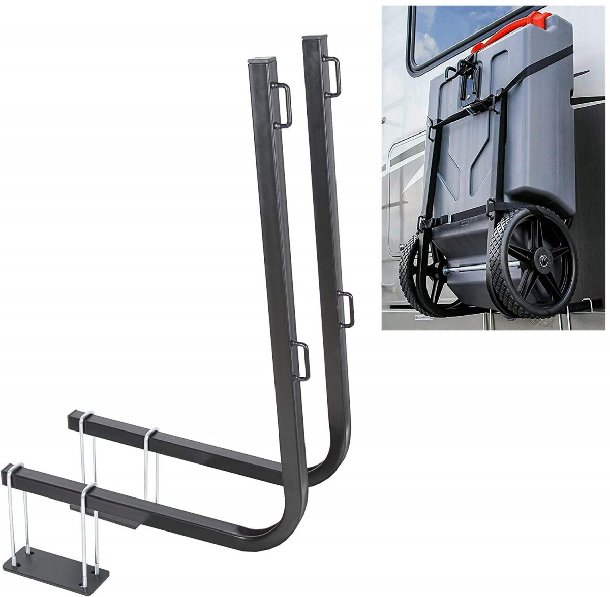 Holds all four Rhino Tote Tank sizes (15, 21, 28 and 36 gallons) and is also compatible with most portable waste holding tanks on the market.. Fits 4" and 4-1/2" bumpers, Great for RVs without ladders.. Securely holds your tote tank onto standard RV bumpers, also includes straps to secure your tote tank in place.. Offer maximum durability. Made of Steel. Industrial grade black powder coating.. Our product is your better choice, you can rest assured use..Other fine products