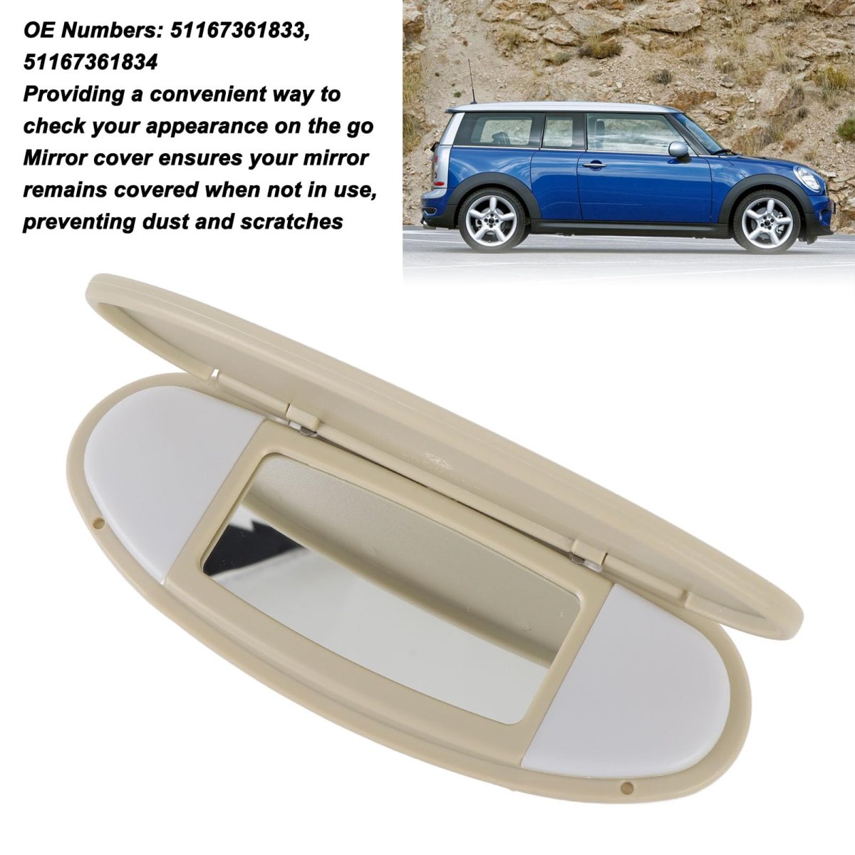 [Enhanced Design] Not only does this cover protect the mirror, but it also elevates the interior decor of your vehicle, adding a sophisticated touch.. [Long Lasting Materials] Constructed from high-grade abs and glass, this cover resists wear and tear while maintaining its elegant appearance for long-lasting use.. [Easy Installation] With a user-friendly design, replacing the old or damaged cover is quick and straightforward, requiring no special tools for easy process.. [Protective Function] Keep your mirror covered when not in use, preventing dust and scratches while providing a discreet way to check your appearance on the go.. [Seamless Integration] Offering a snug fit for r55 r56 r57 r58 r59 r60 r61 2007-2014, this sunshade visor mirror cover seamlessly blends into your car's interior..Other fine products