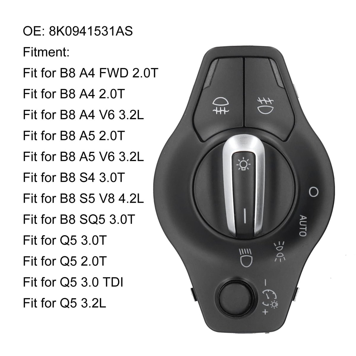 [Easy and Quick Installation] Simple and fast installation process without complicated operations.. [Premium Durability and Stability] Crafted from premium quality plastic material for stability and long-lasting performance.. [Compatible with A Wide Variety of car types] 8K0941531as, fit for s4 s5 .. Replacement Part] Original standard design for a trustworthy replacement of old or broken headlight switch.. [Enhanced Control and Sensitivity] Advanced manufacturing and high sensitivity for improved headlight control..