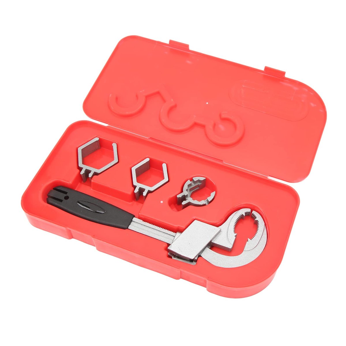 [VERSATILE SINK WRENCH] suitable for multiple applications in the home. PRECISE ADJUSTMENT with push switch feature for optimal control. STABLE AND NON-SLIP DESIGN for secure grip on various sink pipes. COMBINATION OF ABS PLASTIC AND ALUMINUM ALLOY for lasting performance. HANDY STORAGE BOX included for easy organization and portability.