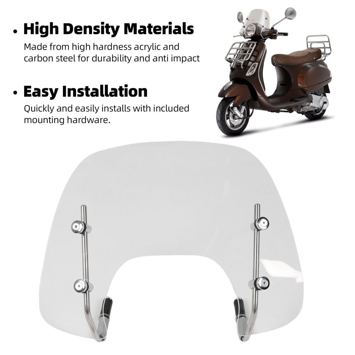 FitmentThis windshield serves as a replacement for Sprint 125 150 2016-2022 and Sprint 150S 2022 users should confirm their compatibility before purchase.. High Density MaterialsThe windshield kit utilizes high hardness acrylic and carbon steel to ensure durability and anti-impact for long-lasting road performance.. Enhanced Riding ComfortThe wind deflector diverts wind away from the rider while protecting against debris like rocks and gravel making for a more comfortable ride.. Easy InstallationThe windshield comes with mounting hardware enabling quick and easy installation allowing users to spend more time riding and less time setting up.. Stylish DesignWith its design this windshield enhances the overall appearance of the bike making it stand out for a unique look on the road..