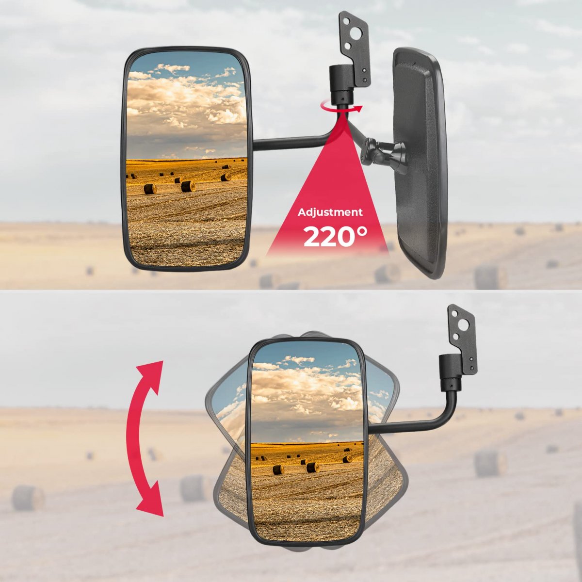 CompatibilityCompatible with Kubota RTV X1100C, RTV 1100 (X Series Accessories).. Wider Vision & SaferKEMIMOTO UTV side mirrors dimenions are 13.38" wide and 7.87" tall, with convex mirror that looks big enough for wider vision, making it easy to see blind spots behind. Even in harsh terrain and during turns, it also can provide drivers a safer driving experience.. Easier to InstallSimply remove a couple nuts and bolts, then replace them with the ones we provide you.. Durability and SturdyKEMIMOTO UTV side mirrors has high impact ABS housing and plastic with shock protection and it is made of coating with rubber ring and aluminum bracket, scratch resistant and durable.. AdjustabilityThe side view mirrors can help you find the most suitable angle. They can be finely adjusted to various angles by using their ball head or aluminum bracket. And it is tested professionally to provide you with the highest levels of performance and availability under tough conditions, keeping it away from vibration or looseness..Other fine products