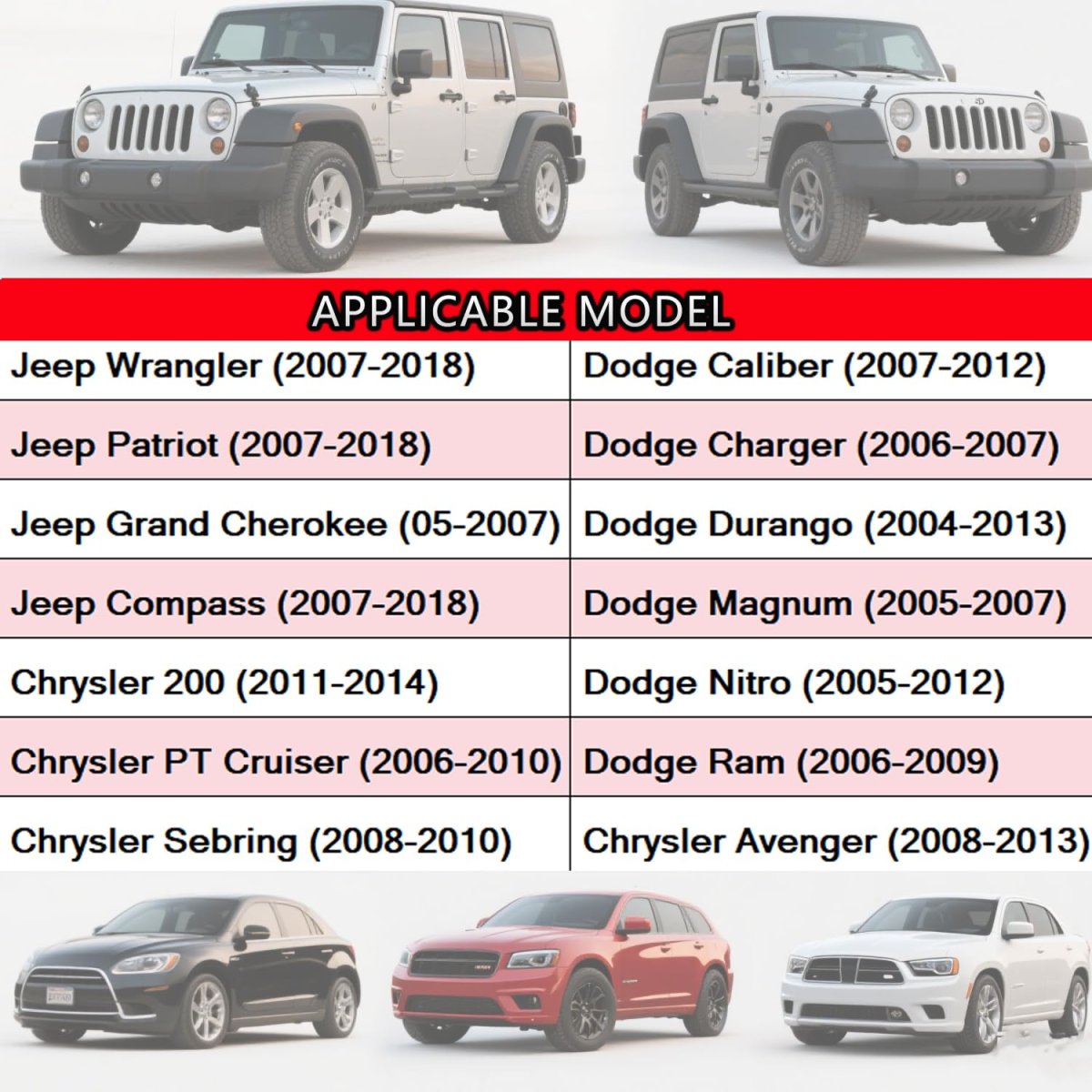 Wide Application The Molded Key Fob Cover is designed to perfectly fit a wide range of vehicles including Jeep Wrangler (2007-2018), Patriot (2007-2018), Grand Cherokee (2005-2007), Compass (2007-2018), Chrysler 200 (2011-2014), PT Cruiser (2006-2010), Sebring (2008-2010), Avenger (2008-2013), Caliber (2007-2012), Charger (2006-2007), Durango (2004-2013), Magnum (2005-2007), Nitro (2005-2012), and Ram (2006-2009).. High-Quality Material Crafted from high-strength and impact-resistant PC-ABS plastic, this Key Fob Cover offers excellent stain resistance, durability, lightweight construction, and fadeless performance for long-lasting use.. Enhanced ProtectionProtect your factory key fob from weather conditions and everyday wear and tear with this durable injection-molded replacement case. It distinguishes your key while providing superior protection against scratches and damage..