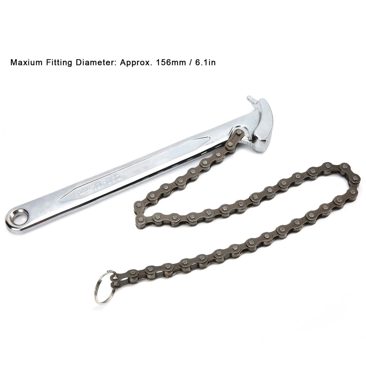 This chain wrench fits diameter up to 6.1 inches, so it works perfectly as filter tool, pipe installation tool, etc.. This chain wrench fits diameter up to 6.1 inches, so it works perfectly as filter tool, pipe installation tool, etc.. This chain wrench fits diameter up to 6.1 inches, so it works perfectly as filter tool, pipe installation tool, etc.. The tightly connected chain ensures strong holding and catching, which promises working performance.. Through heat treatment, higHquality steel has excellent hardness up to HRC60..Other fine products