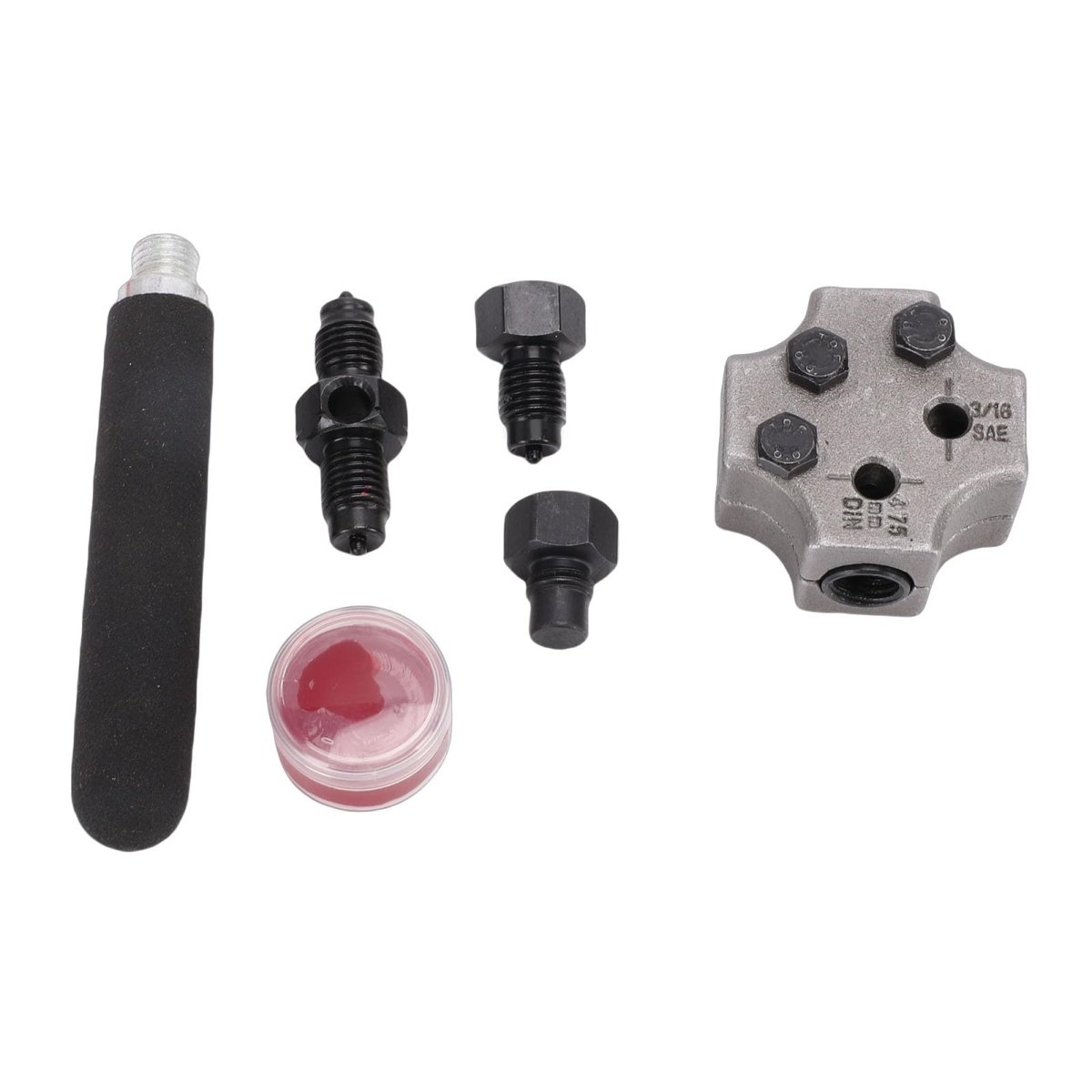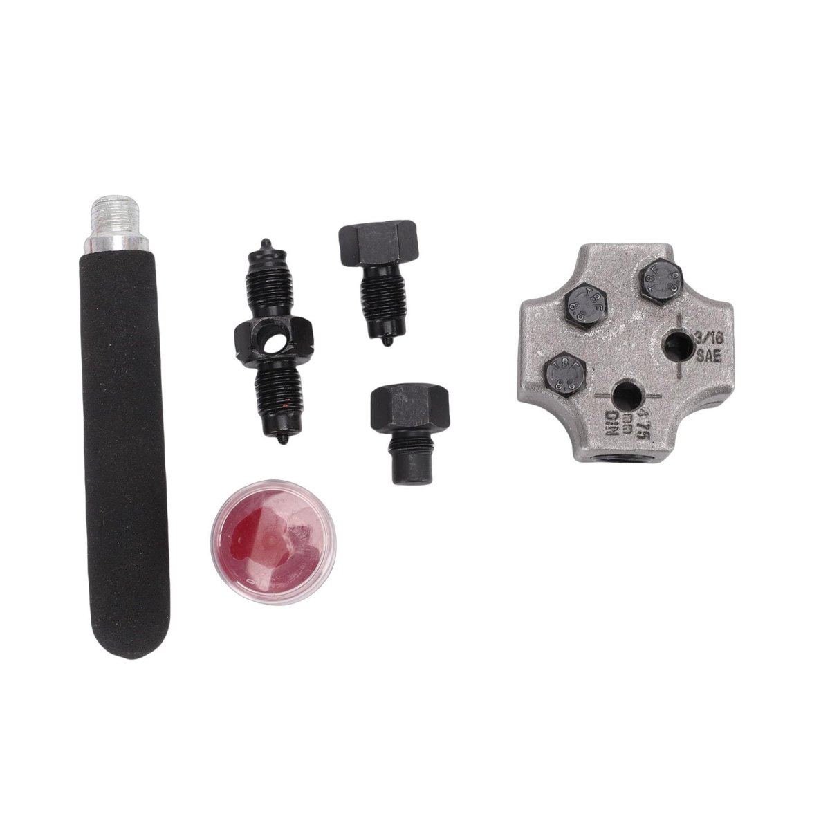 [Accurate Flares] The Brake Line Flaring Tool Kit is suitable for automotive repair, ensuring accurate flares for secure connections and better braking system performance.. [Convenient Design] This Brake Line Flaring Tool Kit is designed for in vehicle and under vehicle use, enabling easy creation of double flares even in confined spaces.. [Effortless Flaring] This Brake Line Flaring Tool Kit allows you to effortlessly create 45 degree sae flares on 3/16 inch tubing, saving half the time compared to traditional methods.. [Durable Materials] The Brake Line Flaring Tool Kit is crafted from steel and aluminum alloy for long-lasting durability and professional-grade performance.. [Removable Die Feature] The removable die allows compatibility with a bench vise, providing added convenience and flexibility during use..Other fine products