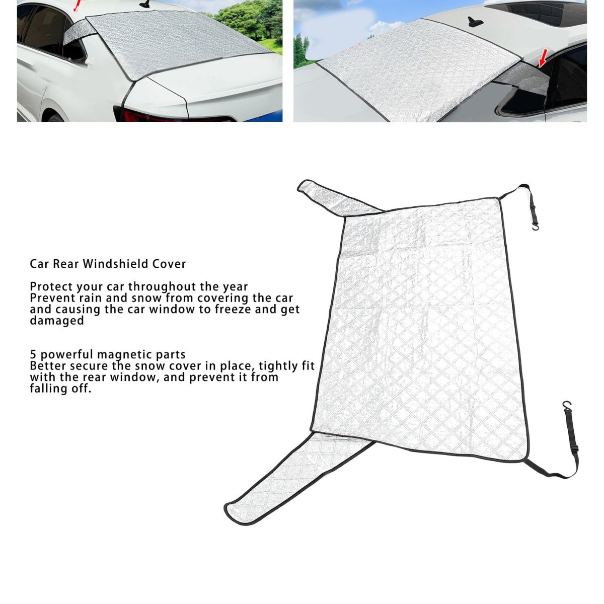 [All Season ] your vehicle from harsh elements with this versatile rear window snow cover. effectively resists heavy snow freezing rain frost and winter debris accumulation. keeps your rear view clear and unobstructed no matter the season. perfect for year round use in all climates from scorching summers to freezing winters.. [Strong Magnetic Security] Equipped with 5 powerful magnets along the edges this rear window frost protector offers effortless installation and reliable hold. the discreet magnetic design blends seamlessly with your vehicle's contours while providing exceptional wind resistance. stays firmly in place during harsh weather yet removes easily when needed.. [Scratch Free Soft Backing] The smooth inner lining of this rear window ice frost snow cover features a gentle non abrasive surface that protects your car's paint and glass from scratches. this thoughtful design extends your vehicle's lifespan while minimizing friction and noise during installation and removal. the protective layer maintains its integrity through repeated use.. [99% Sunlight Blockage] This advanced car rear windshield snow ice cover blocks 99% of harmful rays and sunlight. keeps your vehicle interior significantly cooler in summer months while preventing sun damage to your rear windshield and upholstery. the reflective surface effectively bounces back heat and light maintaining optimal cabin temperature.. [Premium Dual Layer Protection] The car rear windshield cover is crafted from aluminum film composite cotton material featuring a robust dual layer design. this innovative construction provides superior protection against snow frost dust and harmful light rays ensuring your rear window stays pristine in all weather conditions. the durable materials withstand extreme temperatures year after year..Other fine products