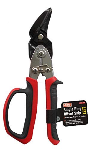 KING Single Ring Offset Snips come in straight, right, and left cut.. Cuts 18-Gauge sheet metal.. Ideal for vinyl siding, screening, cardboard, leather, copper,aluminum, brass, low carbon steel, tin and other 18-Gauge sheet metal.. Extra-Large, Ringed TPR Handle for slip resistance and extra comfort.. More cuts, less effort..Other fine products