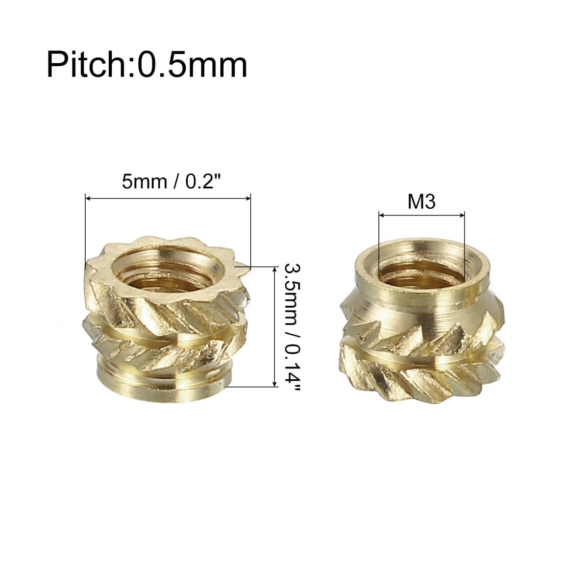 Specification - Thread Size: M3 x 0.5mm(Dia*Pitch); Overall Size: 3.5mm x 5mm / 0.14" x 0.2"(L*OD); Package Content: 130pcs x Knurled Insert Nuts. Material - Made of brass material, high hardness and durable. Provides good mechanical properties with increased corrosion and heat resistance.. Feature - The embedding nut has a guide so there is no need for a counterbore or countersink. Smooth surface, firm and uniform, easy to install.. Advantage - Due to the embossing process on the outer diameter of the insert, it forms certain friction and bites force with the brass insert after forming, which can be fixed on the inside so that it will not fall off easily. Has a certain torsion and tension.. Application - Can be installed by ultrasonic or heat into the plastic matrix, or formed during the injection, widely used in 3D printing injection molding, computer products, electronic products, circuit board fixing, etc., to achieve tight fixing..Other fine products