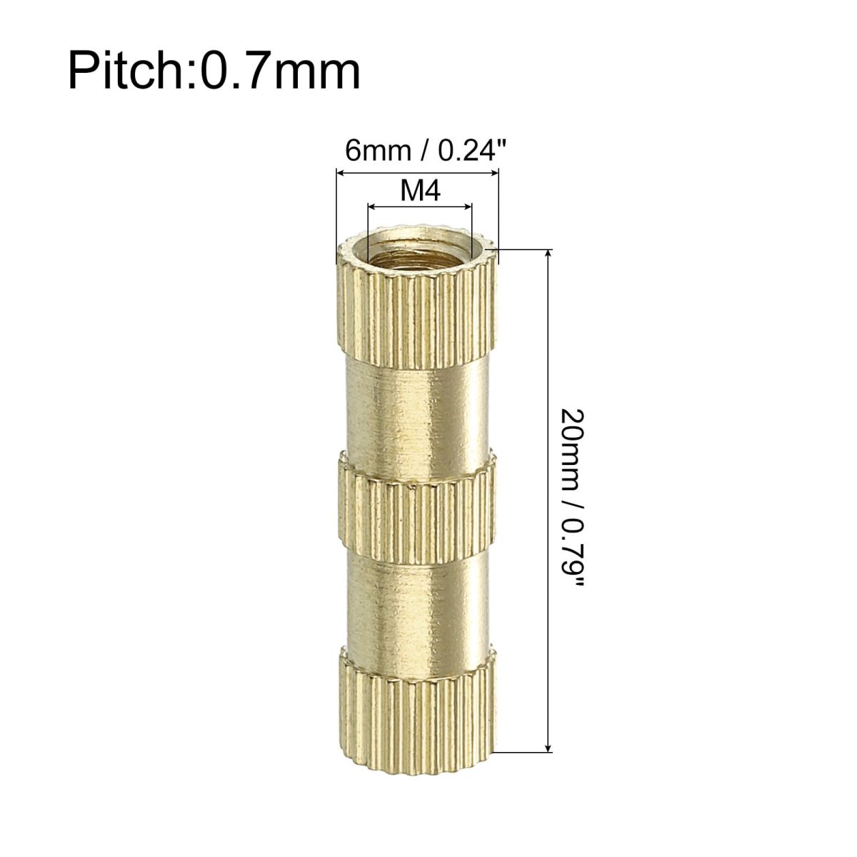 Thread Size: M4x0.7mm; Total Length: 20mm/0.79"; Outer Diameter+0.5/-0mm: 6mm/0.24"; Package Content: 15 x Knurl Thread Inserts Nuts. Material - Made of brass material, high hardness and durable. Provides good mechanical properties with increased corrosion and heat resistance. The high thermal conductivity of brass thread inserts means faster heating and insertion into plastic parts.. Feature - The embedding nut has a guide so there is no need for a counterbore or countersink. Smooth surface, firm, and uniform, easy to install.. Advantage - Due to the embossing process on the outer diameter of the insert, it forms certain friction and bites force with the brass insert after forming, which can be fixed on the inside so that it will not fall off easily. Has a certain torsion and tension.. Application - Can be installed by ultrasonic or heat into the plastic matrix, or formed during the injection, widely used in 3D printing injection molding, computer products, electronic products, circuit board fixing, etc., to achieve tight fixing..Other fine products