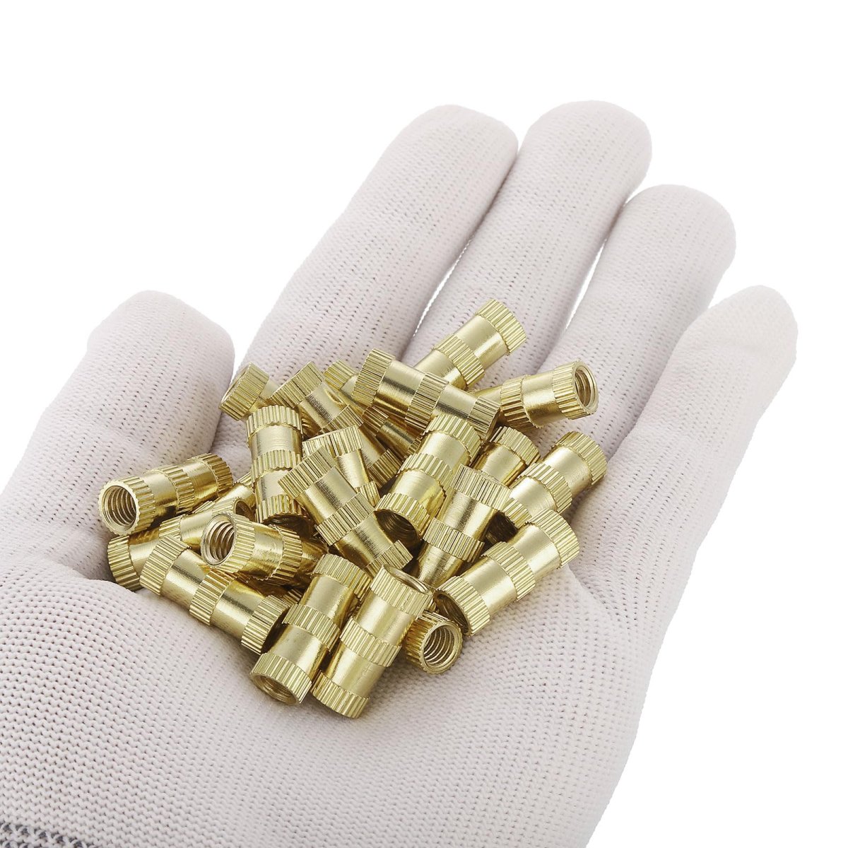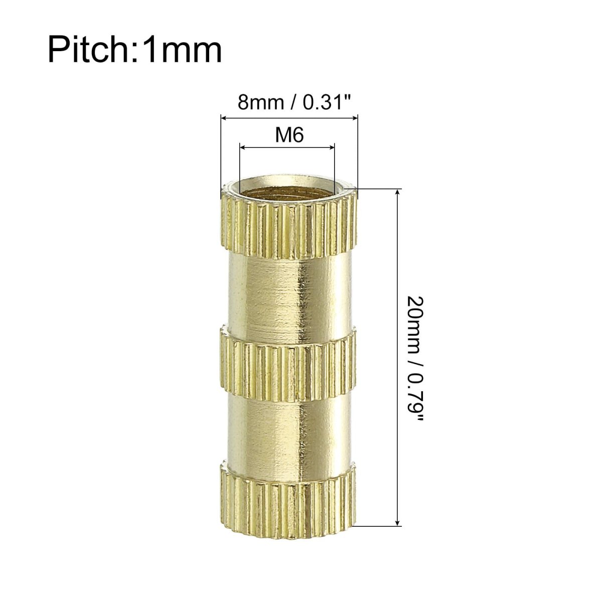 Thread Size: M6x1mm; Total Length: 20mm/0.79"; Outer Diameter+0.5/-0mm: 8mm/0.31"; Package Content: 15 x Knurl Thread Inserts Nuts. Material - Made of brass material, high hardness and durable. Provides good mechanical properties with increased corrosion and heat resistance. The high thermal conductivity of brass thread inserts means faster heating and insertion into plastic parts.. Feature - The embedding nut has a guide so there is no need for a counterbore or countersink. Smooth surface, firm, and uniform, easy to install.. Advantage - Due to the embossing process on the outer diameter of the insert, it forms certain friction and bites force with the brass insert after forming, which can be fixed on the inside so that it will not fall off easily. Has a certain torsion and tension.. Application - Can be installed by ultrasonic or heat into the plastic matrix, or formed during the injection, widely used in 3D printing injection molding, computer products, electronic products, circuit board fixing, etc., to achieve tight fixing..Other fine products