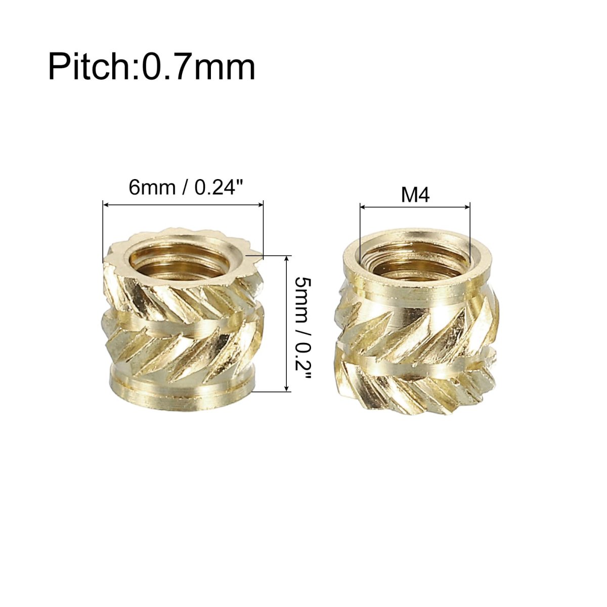 Specification - Thread Size: M4 x 0.7mm(Dia*Pitch); Overall Size: 5mm x 6mm / 0.2" x 0.24"(L*OD); Package Content: 60pcs x Knurled Insert Nuts. Material - Made of brass material, high hardness and durable. Provides good mechanical properties with increased corrosion and heat resistance.. Feature - The embedding nut has a guide so there is no need for a counterbore or countersink. Smooth surface, firm and uniform, easy to install.. Advantage - Due to the embossing process on the outer diameter of the insert, it forms certain friction and bites force with the brass insert after forming, which can be fixed on the inside so that it will not fall off easily. Has a certain torsion and tension.. Application - Can be installed by ultrasonic or heat into the plastic matrix, or formed during the injection, widely used in 3D printing injection molding, computer products, electronic products, circuit board fixing, etc., to achieve tight fixing..