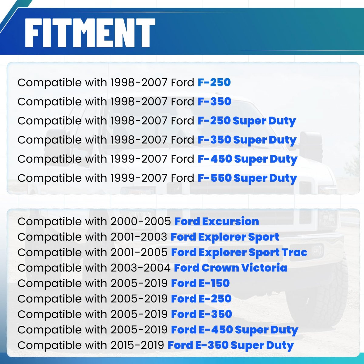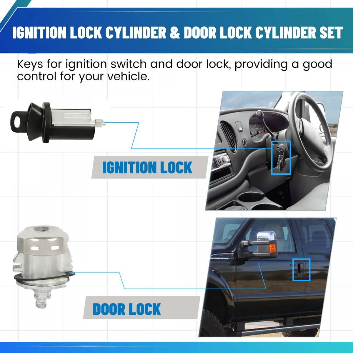 Fitment: Compatible with 2000-2005 Ford Excursion; compatible with 1998-2007 F-250 F-350; Compatible with 1998-2007 Ford F-250 F-350 Super Duty; Compatible with 1999-2007 F-450 F-550 Super Duty; Compatible with 2003-2004 Ford Crown Victoria; Compatible with 2005-2019 Ford E-150 E-250 E-350; Compatible with 2015-2019 Ford E-350 Super Duty; Compatible with 2005-2019 Ford E-450 Super Duty; Compatible with 2001-2003 Ford Explorer Sport; Compatible with 2001-2005 Ford Explorer Sport Trac.. Superior Material: Made of aluminium & plastic, durable, stable and reliable, high strength, good impact resistance and not easy to damage, can accompany you for a long time.. Excellent Performance: The previous lock cylinder and ignition switch on the vehicle will fail due to excessive motor wear. Our ignition lock cylinder & door lock cylinder set is designed to replace old or defective one, providing a good control for your vehicle.. Package Included: Mounting hardware and instructions are NOT included. You will receive 1 x Ignition Switch Lock Cylinder; 2 x Door Lock Cylinders and 2 x Keys.. Easy Installation: No additional modifications and special tools required, direct replacement and easy to install..Other fine products