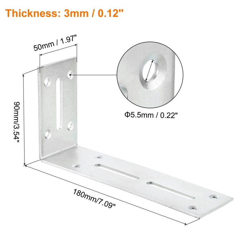 [Basic Size] - Introducing our Adjustable Corner Brackets, designed to provide versatile support for your projects. With overall dimensions of 180 x 50 x 90 mm, a thickness of 3mm, and 5.5mm diameter holes.. [Good Material] - Our Adjustable Corner Brackets are constructed from durable cold-rolled steel, known for their strength and reliability. This material ensures that the brackets can withstand heavy loads without bending or warping, providing long-lasting performance. The galvanized finish adds an extra layer of protection against rust and corrosion, making these brackets suitable for indoor and outdoor use.. [Adjustable Hole Positions] - Featuring adjustable hole positions, our corner brackets offer flexibility in installation and customization. The holes allow for easy adjustment and alignment, accommodating various project requirements. This adjustability enables you to achieve the perfect fit for your shelves, cabinets, furniture, and more.. [Easy to Install] - Installing our Adjustable Corner Brackets is quick and straightforward. Each bracket comes with pre-drilled holes and mounting hardware, ensuring easy and hassle-free installation. Whether you're a DIY enthusiast or a professional, you'll enjoy the user-friendly design and convenience of our brackets.. [Scope of Application] - Our Adjustable Corner Brackets are widely used in various projects and applications. They can be utilized for constructing shelves, cabinets, frames, and other furniture pieces, or serve as a corner connection. Their versatility and adjustability make them suitable for both residential and commercial use. Whether you are remodeling your home or working on a professional project, these brackets provide reliable support and stability..Other fine products