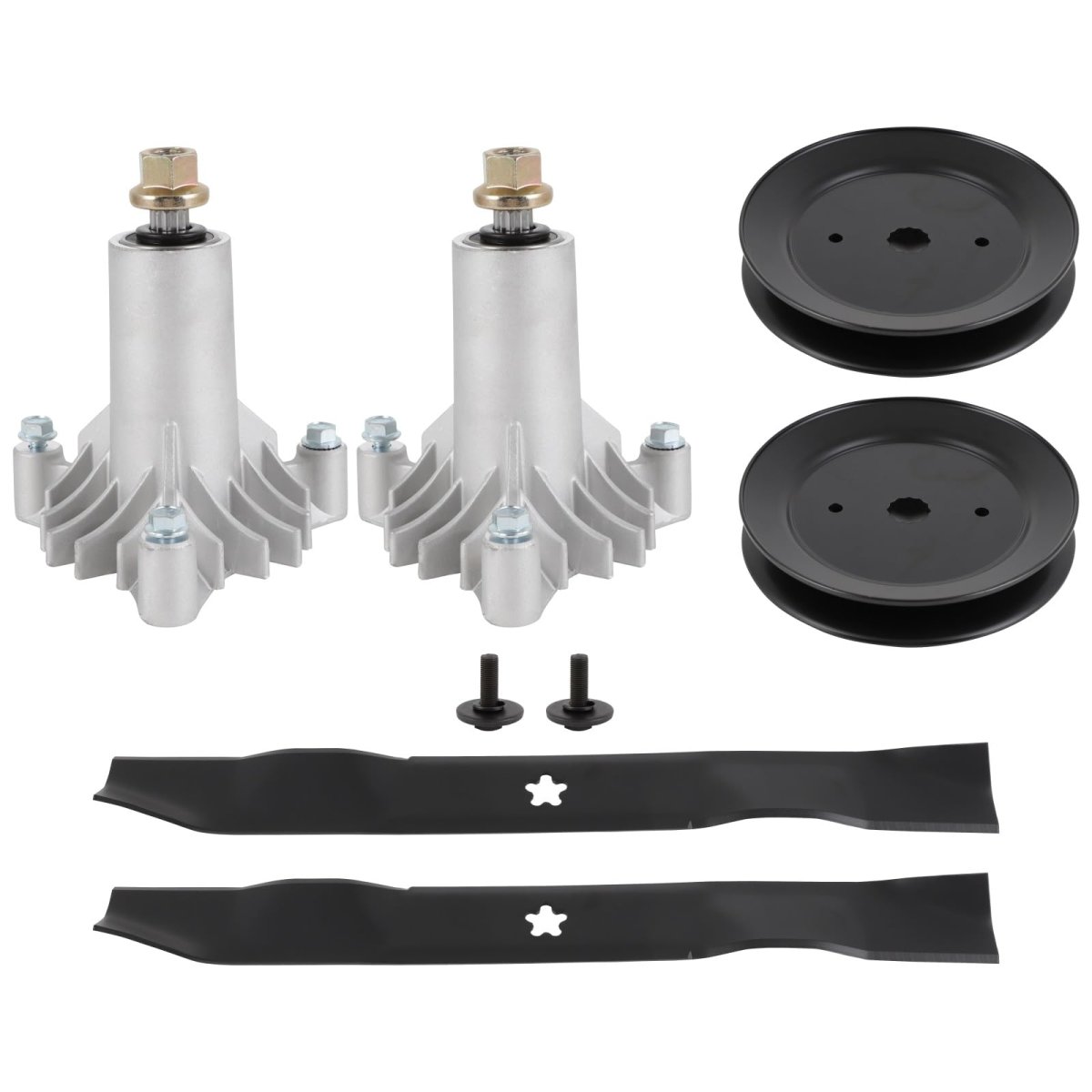 Compatible: 42" Models LT1000 and LTX1000. Package Information: 2 spindle assembly, 2 pulleys, 2 mower blades for replacement. Blade Replaces OEM: 6189, 134149, 532134149, 594892701; PULLEYS OEM: 153535, 173436,532129861, 532173436, 129861,177865. Spindle Assembly Replaces OEM: 130794, 128285, 133172, 137641, 137645, 532130794, 532128285, 532133172, 532137645, 8479. High Toughness: Belt fabric covering provides endurance against high operational heat and increased wear resistance, the blades perfect fit with the corresponding spindle assembly, can help you cut weeds and leaves perfectly.Other fine products