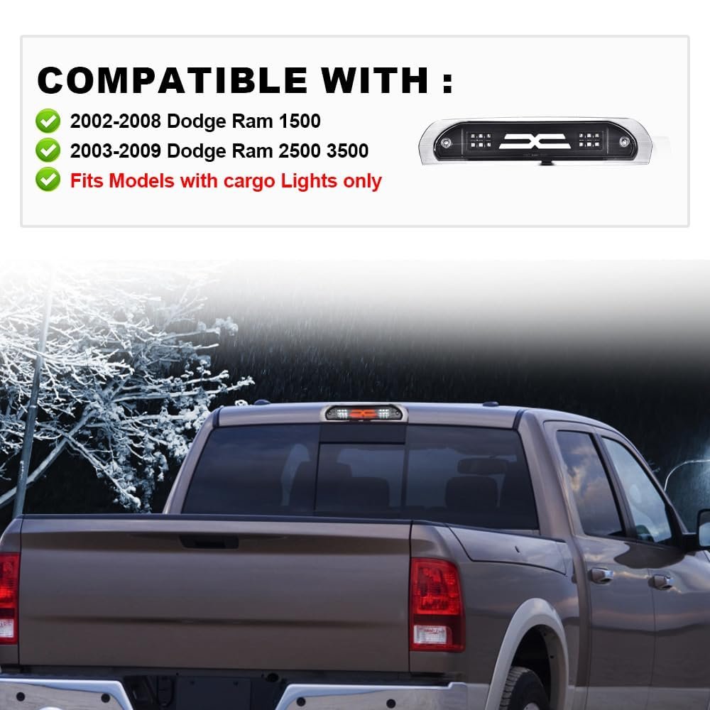 Vehicle Suitability - Brake Light Compatible with Dodge Ram 1500 2002-2008/Compatible with Dodge Ram 2500 3500 2003-2009(Fits Models with Cargo Lights Only). Reference Oem Part Number: 5072594AB, 5072594AD, 5072594AC. Brighter & Cooler Lighting - The upgraded brake lamp assembly adds LED BAR,providing additional brake lighting to improve safety and high recognition.. Complete Packaging - Complete box packaging, never used before.. Easy to install - This product is produced strictly according to factory standards, with simple installation steps and time and effort saving.Other fine products