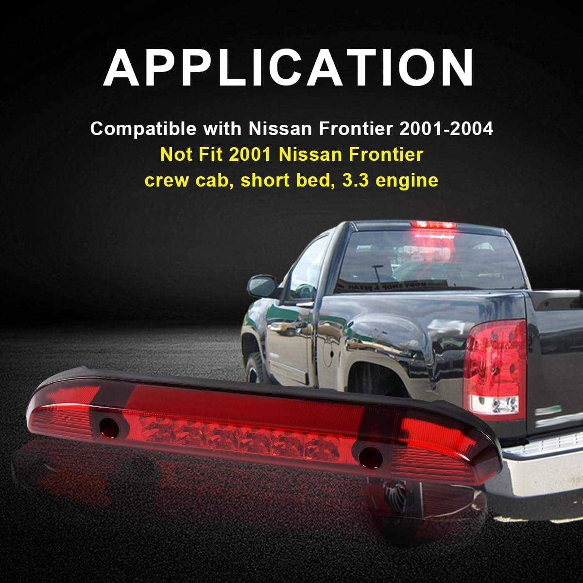 Vehicle Suitability - Rear Cargo Light Compatible with Nissan Frontierh 2001 2002 2003 2004 (No Compatible with 2001 Nissan Frontier, crew cab, short bed, 3.3 engine). Clear Visibility - Rear high-mounted brake light not only provides a cool look and excellent illumination, but It also improves safety and high recognition. The brake light comes on faster to avoid tailgating accidents.. Material - Made of material, it is sturdy and durable and not easily damaged. Combined with exquisite manufacturing process, it extends the service life.. Excellent Workmanship - Meets the Original Equipment (OE) standards, ensuring replacement fit just like the original.. Installation - Manufactured according to factory specifications. If you have no installation experience, professional installation is highly recommended..Other fine products